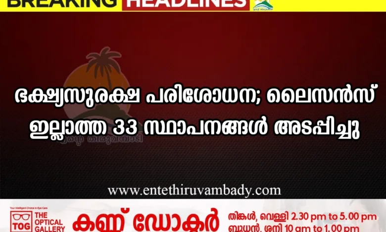 സ്കൂൾ പരിസരത്ത് ഭക്ഷ്യസുരക്ഷ പരിശോധന; ലൈസൻസ് ഇല്ലാത്ത 33 സ്ഥാപനങ്ങൾ അടപ്പിച്ചു
