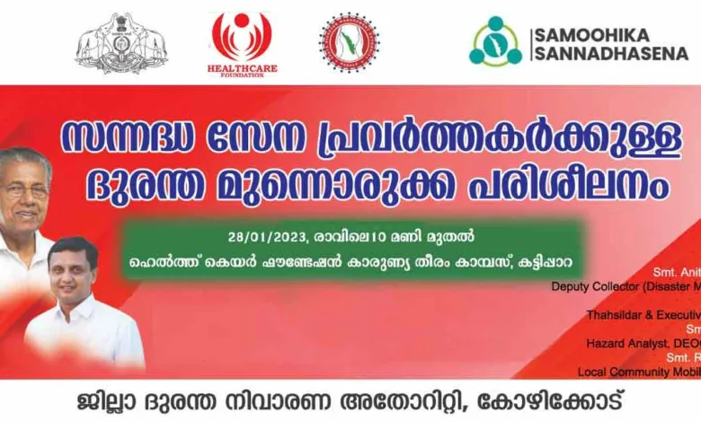താമരശ്ശേരി:കേരള സർക്കാറിൻ്റെ സന്നദ്ധ സേന പ്രവർത്തകർക്കുള്ള സൗജന്യ ദുരന്ത മുന്നൊരുക്ക പരിശീലനം 2023 ജനുവരി 28 ന് രാവിലെ 9 മണി മുതൽ താമരശേരി കട്ടിപ്പാറ ഹെൽത്ത് കെയർ ഫൗണ്ടേഷൻ കാരുണ്യ തീരം കാമ്പസിൽ (കോളിക്കൽ – കയ്യൊടിയൻപാറ) നടക്കും.
