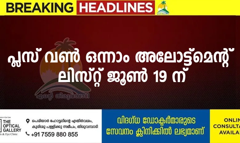 പ്ലസ് വൺ ഒന്നാം അലോട്ട്‌മെന്റ് ലിസ്റ്റ് ജൂൺ 19 ന്