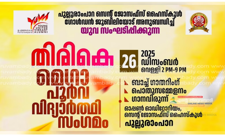 പുല്ലൂരാംപാറ :സെൻറ് ജോസഫ് ഹൈസ്കൂൾ പുല്ലൂരാംപാറയുടെ സുവർണ്ണ ജൂബിലി ആഘോഷങ്ങളോട് അനുബന്ധിച്ച് സ്കൂളിലെ പൂർവ്വ വിദ്യാർത്ഥി സംഘടനയായ ‘യുവ’ ‘തിരികെ 2025’ എന്ന പേരിൽ മെഗാ പൂർവ്വ വിദ്യാർത്ഥി സംഗമം ഒരുക്കുന്നു.