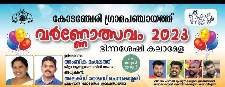 കോടഞ്ചേരി ഗ്രാമപഞ്ചായത്തിലെ 147 ഭിന്നശേഷിക്കാരും അവരുടെ മാതാപിതാക്കളും വർണ്ണ ഉത്സവത്തിൽ പങ്കെടുക്കുന്നു. വർണോത്സവത്തിന്റെ ഉദ്ഘാടനം ജില്ലാ പഞ്ചായത്ത് മെമ്പറും ജില്ലാ ആസൂത്രണ സമിതി അംഗവുമായ അംബിക മംഗലത്ത് നിർവഹിക്കുന്നു. കോടഞ്ചേരി ഗ്രാമപഞ്ചായത്ത് പ്രസിഡന്റ് അലക്സ് തോമസ് ചെമ്പകശ്ശേരി അധ്യക്ഷൻ ആകുന്ന യോഗത്തിൽ വിവിധ ചാനൽ പ്രോഗ്രാമുകളിലൂടെ ശ്രദ്ധേയരായ അണിനിരക്കുന്ന കലാവിരുന്നും ഉണ്ടായിരിക്കും. ഭിന്നശേഷി കലാമേളയിൽ പങ്കെടുക്കുന്ന എല്ലാവർക്കും സമ്മാനങ്ങളും ഉണ്ടായിരിക്കുന്നതാണ്.