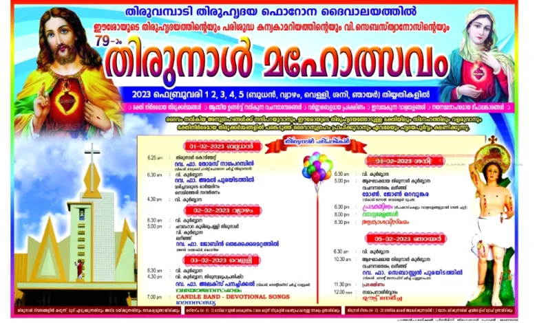 തിരുവമ്പാടി : തിരുഹൃദയ ഫൊറോന ദൈവാലയത്തിൽ ഈശോയുടെ തിരുഹൃദയത്തിന്റെയും പരിശുദ്ധ കന്യകാമറിയത്തിന്റെയും വിശുദ്ധ സെബസ്ത്യാനോസിന്റെയും തിരുനാൾ മഹോത്സവം ഫെബ്രുവരി 1 മുതൽ 5 വരെ ആഘോഷിക്കും.നാളെ രാവിലെ 6 – 25 ന് ഇടവക വികാരി ഫാ. തോമസ് നാഗപറമ്പിൽ തിരുനാൾ കൊടിയേറ്റ് നടത്തും.
