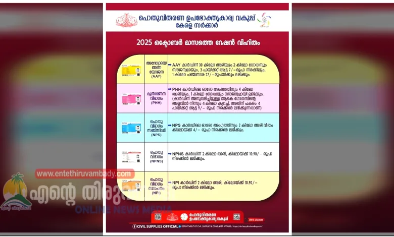 (3) 2025 ഒക്ടോബർ മാസത്തെ റേഷൻ വിതരണം 04.10.2025 (ശനിയാഴ്ച) മുതൽ ആരംഭിക്കുന്നതാണ്.