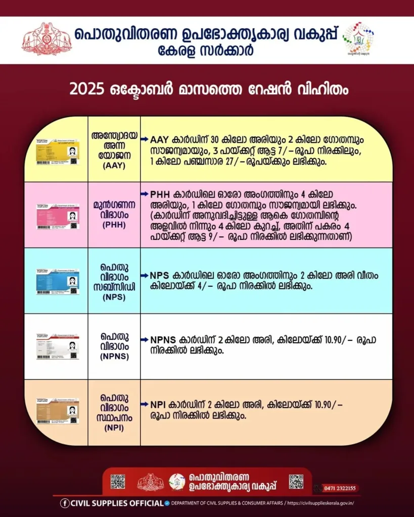 (5) എല്ലാ വിഭാഗം റേഷൻ കാർഡുകൾക്കും അനുവദിച്ചിട്ടുള്ള, 2025 ഒക്ടോബർ മാസത്തെ റേഷൻ വിഹിതം ചുവടെയുള്ള ചിത്രത്തിൽ ഉൾപ്പെടുത്തിയിരിക്കുന്നു…