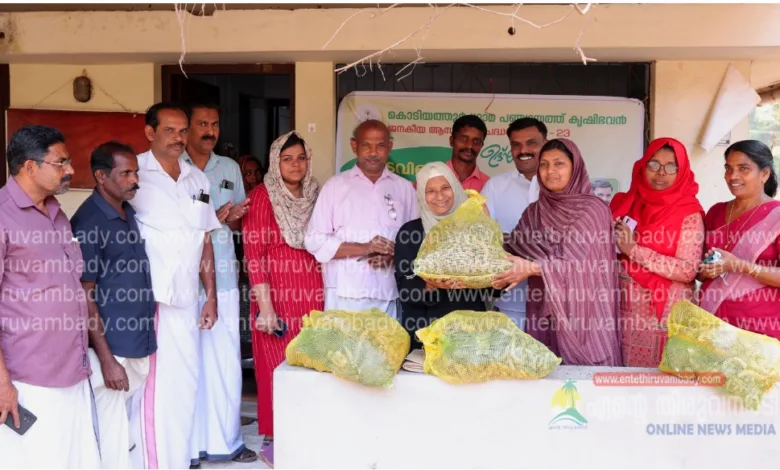 കൃഷിഭവൻ പരിസരത്ത് നടന്ന ചടങ്ങിൽ ഗ്രാമപഞ്ചായത്ത് പ്രസിഡൻ്റ് വി.ഷംലൂലത്ത് വിതരണോദ്ഘാടനം നിർവഹിച്ചു. വൈസ് പ്രസിഡൻ്റ് ഷിഹാബ് മാട്ടുമുറി അധ്യക്ഷത വഹിച്ചു. സ്റ്റാൻ്റിംഗ് കമ്മറ്റി ചെയർപേഴ്സൺ ആയിഷ ചേലപ്പുറത്ത്, പഞ്ചായത്തംഗങ്ങളായ ബാബു പൊലുകുന്ന്, രതീഷ്കളക്കുടിക്കുന്ന്, രിഹ്ല അബ്ദുൽ മജീദ്, ടി.കെ അബൂബക്കർ, കോമളം തോണിച്ചാൽ, കൃഷി ഓഫീസർ കെ.ടി ഫെബിദ തുടങ്ങിയവർ സംബന്ധിച്ചുചിത്രം: