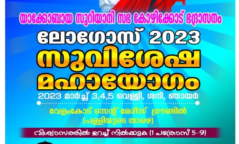 വേളംകോട് : യാക്കോബായ സഭയുടെ കോഴിക്കോട് ഭദ്രാസനത്തിന്റെ ആഭിമു ഖ്യത്തിൽ നടത്തിവരുന്ന സുവിശേഷ മഹായോഗം “ലോഗോസ് 2023 മാർച്ച് 3, 4, 5 (വെള്ളി, ശനി, ഞായർ ദിവസങ്ങളിൽ വൈകുന്നേരം 6 മുതൽ 9.00 വരെ വേളംകോട് സെന്റ് മേരീസ് ഗ്രൗണ്ടിൽ (പള്ളിയുടെ താഴെ വെച്ച് നടത്തപ്പെടുന്നു. ആദ്വദിനം അഭി. പൗലോസ് മോർ ഐറേനിയോസ് മെത്രാപ്പോലിത്തയുടെ അദ്ധ്യക്ഷതയിൽ മലബാർ ഭദ്രാസനാധിപൻ അഭി. ഗീവർഗ്ഗീസ് മോർ സ്തേഫാനോസ് മെത്രാപ്പോലീത്ത ഉദ്ഘാടനം നിർവ്വഹിക്കുന്നു. എല്ലാ ദിവസങ്ങളിലും സഭയിലെ പ്രമുഖ വൈദികർ വചനപ്രഘോഷണം നടത്തി ഏവരേയും ക്രിസ്തുവിലേക്ക് നയിക്കുന്നു. സുവിശേഷ മഹായോഗത്തിൽ സംബന്ധിച്ച് അനുഗ്രഹം പ്രാപിക്കുവാൻ ഏവരേയും കർതൃനാമത്തിൽ പ്രാർത്ഥനാപൂർവ്വം ക്ഷണിക്കുന്നു.