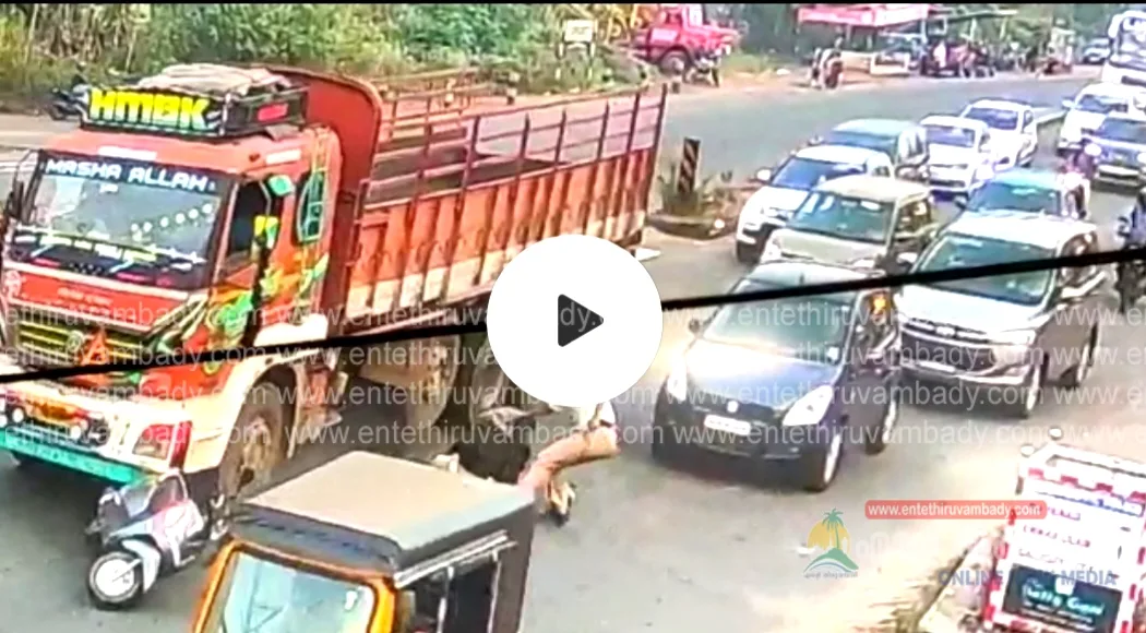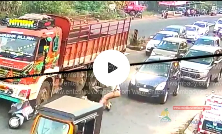 കോഴിക്കോട് സ്കൂട്ടറില് സഞ്ചരിച്ചിരുന്ന സ്ത്രീകള് ലോറിക്ക് തൊട്ടുമുന്നില് വച്ച് വാഹനത്തില് നിന്നും നിയന്ത്രണം വിട്ട് താഴെ വീഴുകയും ലോറിയുടെ ടയറുകള്ക്ക് സമീപത്തേക്ക് പതിക്കുകയും ചെയ്യുന്നതായി വഡിയോയിലുണ്ട്.