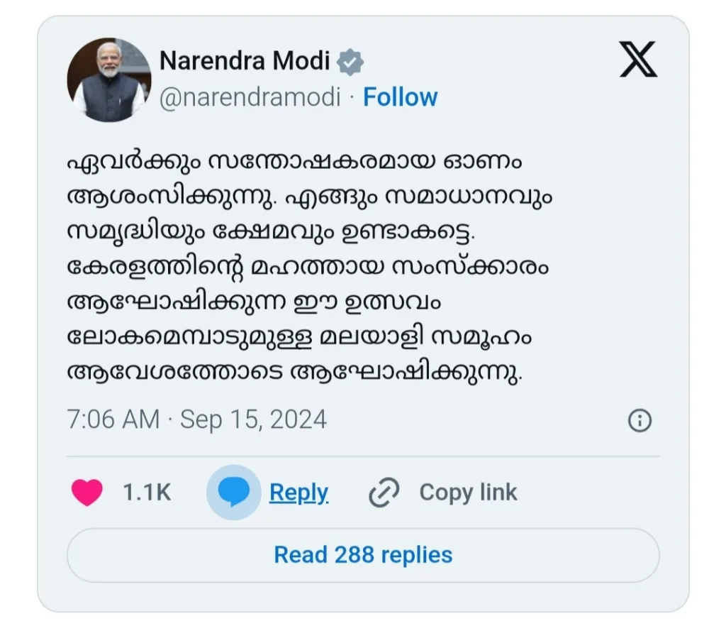 ഏവർക്കും സന്തോഷകരമായ ഓണം ആശംസിക്കുന്നു. എങ്ങും സമാധാനവും സമൃദ്ധിയും ക്ഷേമവും ഉണ്ടാകട്ടെ. കേരളത്തിന്റെ മഹത്തായ സംസ്ക്കാരം ആഘോഷിക്കുന്ന ഈ ഉത്സവം ലോകമെമ്പാടുമുള്ള മലയാളി സമൂഹം ആവേശത്തോടെ ആഘോഷിക്കുന്നു” എന്നായിരുന്നു പ്രധാനമന്ത്രിയുടെ എക്സ് പോസ്റ്റ്. കേന്ദ്ര മന്ത്രി സർബാനന്ദ സോനെവാളും ഓണാശംസകൾ നേർന്നു.
