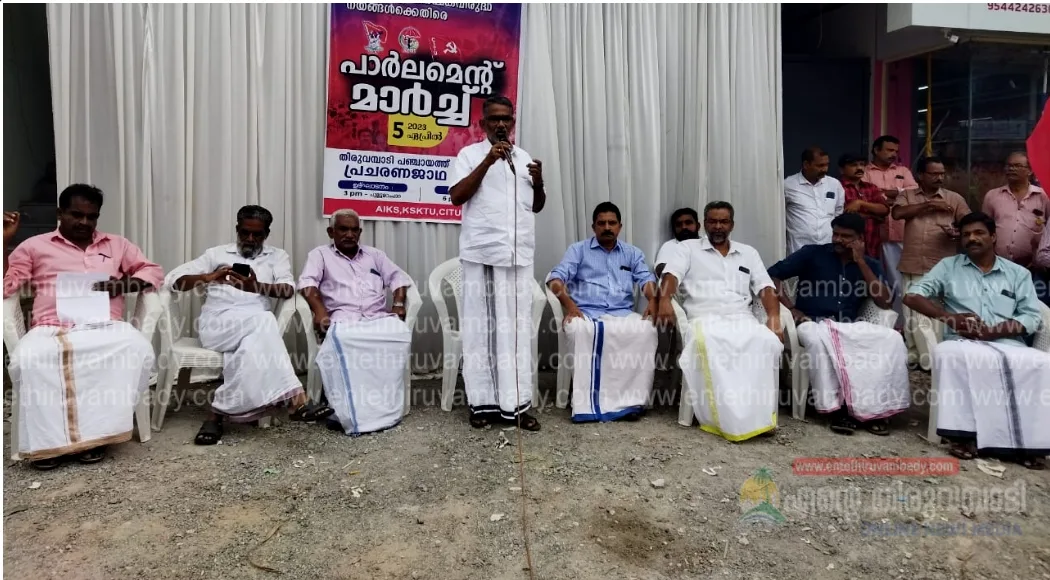 തിരുവമ്പാടി: ഏപ്രിൽ 5 ൻ്റെ പാർലമെൻ്റ് മാർച്ചിൻ്റെ പഞ്ചായത്ത്തല പ്രചാരണ ജാഥ പുല്ലുരാംപാറയിൽ കർഷക സംഘം ഏരിയാ സെക്രട്ടറി – ജോളി ജോസഫ് ഉത്ഘാടനം ചെയ്തു. വിവിധ കേന്ദ്രങ്ങളിലെ സ്വീകരണങ്ങൾക്ക് ശേഷം, ജാഥ തിരുവമ്പാടിയിൽ സമാപിച്ചു. ജാഥാ കേന്ദ്രങ്ങളിൽ ലീഡർ സി.ഗണേഷ് ബാബു, വൈസ് ലീഡർ കെ.കെ.ദിവാകരൻ, പൈലറ്റ് കെ.സജീവ് ,സജീഫിലിപ്പ്, മുസ്തഫ കടമ്പോടൻ, ഇ ജനാർദ്ദനൻ എന്നിവർ സംസാരിച്ചു.