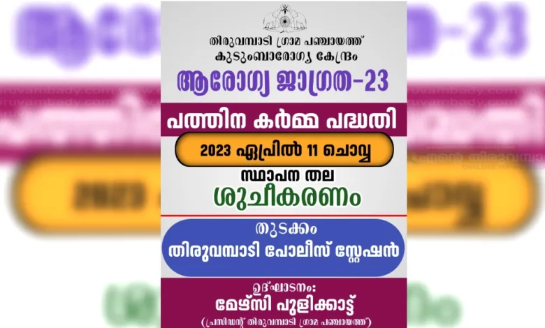 തിരുവമ്പാടി: തിരുവമ്പാടി ഗ്രാമപഞ്ചായത്ത് കുടുംബാരോഗ്യ കേന്ദ്രം പദ്ധതി ‘ആരോഗ്യ ജാഗ്രത-23’ പത്തിന കർമ്മ പദ്ധതിയുടെ ഭാഗമായി സ്ഥാപന തല ശുചീകരണം ഏപ്രിൽ 11 ചൊവ്വാഴ്ച നടക്കും.തിരുവമ്പാടി പോലീസ് സ്റ്റേഷനിൽ തുടക്കം കുറിക്കുന്ന സ്ഥാപന തല ശുചീകരണ പരിപാടി ഗ്രാമപഞ്ചായത്ത് പ്രസിഡന്റ് മേഴ്സി പുളിക്കാട്ട് ഉദ്ഘാടനം ചെയ്യും.