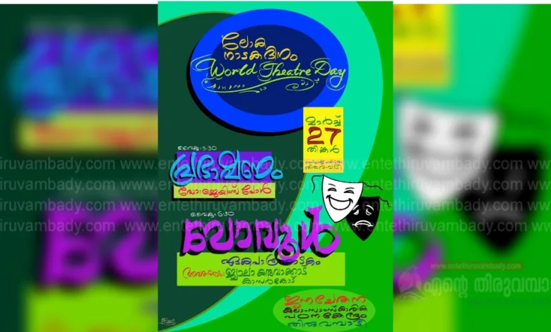 തിരുവാമ്പാടി ജനചേതന കലാ സാംസ്കാരിക പഠനകേന്ദ്രത്തിന്റെ ആഭിമുഖ്യത്തിൽ ലോക നാടക ദിനമായ മാർച്ച് 27 ന് വിവിധ പരിപാടികൾ അരങ്ങേറും. തിങ്കൾ വൈകിട്ട് 5 മണിക്ക് ബസ് സ്റ്റാന്റ് പരിസരത്താണ് പരിപാടികൾ നടക്കുക. ഡോ ജെയിംസ് പോൾ ലോക നാടകദിന സന്ദേശം നൽകും . തുടർന്ന് കാസർകോട് ജ്വാലാ തീയ്യേറ്റേഴ്സിന്റെ ബാവുൾ ഏക പാത്ര നാടകം അവതരിപ്പിക്കും. പയ്യോളി ശശിയുടെ നേതൃത്വത്തിൽ നാടക ഗാനങ്ങളും ആലപിക്കപ്പെടും. ഇതാദ്യമായാണ് ഒരു കുടിയേറ്റ ഗ്രാമത്തിൽ ലോക നാടകദിനത്തിനോടനുബന്ധിച്ച് പരിപാടികൾ അവതരിപ്പിക്കപ്പെടുന്നത്.