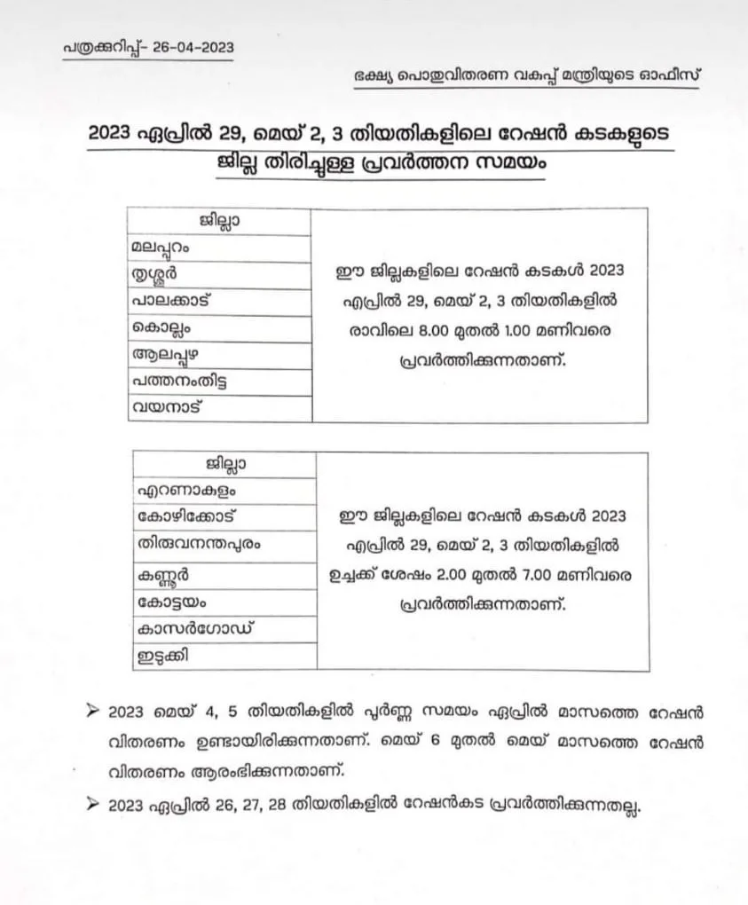 മലപ്പുറം, തൃശൂർ, പാലക്കാട്, കൊല്ലം, ആലപ്പുഴ, പത്തനംതിട്ട, വയനാട് ജില്ലകളിൽ ഏപ്രിൽ 29, മെയ് 2, 3 തീയതികളിൽ രാവിലെ 8 മുതൽ ഉച്ച ഒരു മണി വരെയും എറണാകുളം, കോഴിക്കോട്, തിരുവനന്തപുരം, കണ്ണൂർ, കോട്ടയം, കാസർകോട്, ഇടുക്കി ജില്ലകളിൽ ഈ തീയതികളിൽ ഉച്ച രണ്ടു മുതൽ രാത്രി ഏഴു വരെയും റേഷൻ കടകൾ പ്രവർത്തിക്കും. മെയ് നാല് മുതൽ സാധാരണ സമയക്രമം ആയിരിക്കും.
