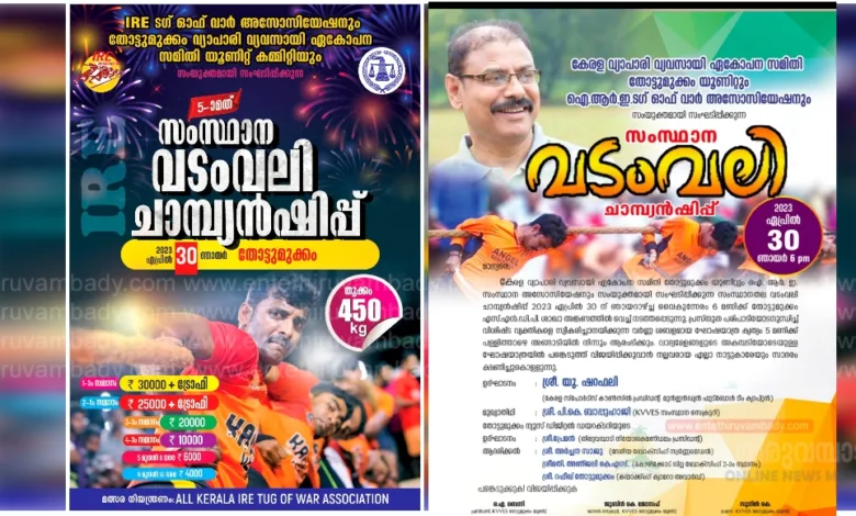 തോട്ടുമുക്കം : കേരളാ വ്യാപാരി വ്യവസായി ഏകോപന സമിതി തോട്ടുമുക്കം യൂണിറ്റും ഐ.ആർ.ഇ.ടഗ് ഓഫ് വാർ അസോസിയേഷനും സംയുക്തമായി സംഘടിപ്പിക്കുന്ന സംസ്ഥാനതല വടംവലി ചാമ്പ്യൻഷിപ്പ് നാളെ (2023 ഏപ്രിൽ 30 ന് ഞായറാഴ്ച) വൈകുന്നേരം 6 മണിക്ക് തോട്ടുമുക്കം എസ്.എൻ.ഡി.പി. ശാഖാ അങ്കണത്തിൽ വെച്ച് അരങ്ങേറും.