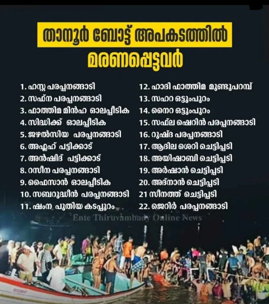 പരപ്പനങ്ങാടി ആവിയിൽ ബീച്ച് കുന്നുമ്മൽ സൈതലവിയുടെ ഭാര്യ സീനത്ത് (43), മക്കളായ ഹസ്ന (18), ഷഫല (13), ഷംന (12), ഫിദ ദിൽന (7), സഹോദരൻ സിറാജിന്റെ ഭാര്യ റസീന (27), മക്കളായ സഹറ (8), നൈറ (7), റുഷ്ദ (ഒന്നര) എന്നിവരാണ് ഒരു വീട്ടിൽനിന്ന് മരിച്ചത്. സൈതലവിയുടെ ബന്ധുക്കളായ ജൽസിയ (45), ജരീർ (12), ജന്ന (8) എന്നിവരാണ് മരിച്ച മറ്റു മൂന്നുപേർ.