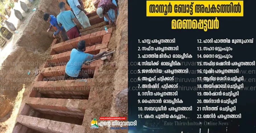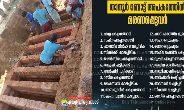 മലപ്പുറം പരപ്പനങ്ങാടി: താനൂർ ബോട്ടപകടത്തിൽ ഒരു കുടുംബത്തിൽനിന്ന് മരിച്ച 11 പേരെ ഒരു ഖബറിൽ അടക്കം ചെയ്യും. പരപ്പനങ്ങാടി കുന്നുമ്മൽ കുടുംബത്തിലെ 11 പേരെയാണ് ഒരേ ഖബറിൽ അടക്കം ചെയ്യുക.