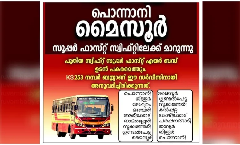 പുതിയ സിഫ്റ്റ് സൂപ്പർഫാസ്റ്റ് എയർ ബസ് നിലവിലെ ബസിന് പകരമെത്തും. KS 253 നമ്പർ സൂപ്പർഫാസ്റ്റ് എയർബസ് ആണ് പൊന്നാനി മൈസൂർ സർവീസിനായി അനുവദിച്ചിരിക്കുന്നത്.