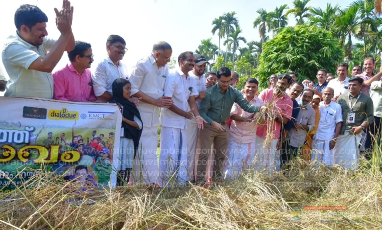 ഓമശ്ശേരി: കൊടുവള്ളി എം.എൽ.എ. ഡോ:എം.കെ.മുനീറിന്റെ നേതൃത്വത്തിൽ മണ്ഡലത്തിൽ ആരംഭിച്ച പതിനഞ്ച് ദിവസം നീണ്ടു നിൽക്കുന്ന ഗ്രാന്റ് കൊടുവള്ളി മണ്ഡലം ഫെസ്റ്റിന്റെ ഓമശ്ശേരി പഞ്ചായത്ത്തല പരിപാടികൾക്ക് കൊയ്ത്തുത്സവത്തോടെ ഉജ്ജ്വല തുടക്കം. ഓമശ്ശേരി റൊയാഡ് ഫാം ഹൗസിലെ ഒരേക്കർ വയലിൽ നടന്ന കൊയ്ത്തുത്സവം ജനപ്രതിനിധികളുടേയും സ്കൂൾ വിദ്യാർത്ഥികളുടേയും സമൂഹത്തിലെ വിവിധ തുറകളിലുള്ളവരുടേയും നിറസാന്നിദ്ധ്യത്തിൽ നാടിന്റെ ആഘോഷമായി മാറി.നെല്ല് കൊയ്തും അവിലുണ്ടാക്കിയും കപ്പ ചുട്ടും വയലിലെ ചെളിയിൽ കളിച്ചുല്ലസിച്ചും മണിക്കൂറുകൾ നീണ്ടു നിന്ന കൊയ്ത്തുത്സവം അക്ഷരാർത്ഥത്തിൽ നാട്ടുത്സവമായി മാറുകയായിരുന്നു.
