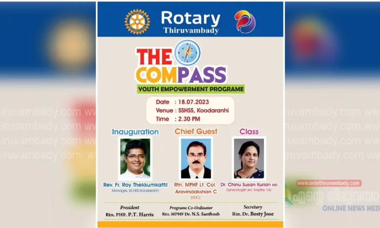 തിരുവമ്പാടി: സ്വന്തം ശക്തി ദൗബല്യങ്ങളെ തിരിച്ചറിയുമ്പോഴാണ് ഒരു വ്യക്തിയുടെ വിജയം ആരംഭിക്കുന്നത്. ജീവിതത്തിന്റെ മുന്നോട്ടുള്ള യാത്രയിൽ വഴിതെറ്റാതെ ദിശ അറിയിക്കുന്ന അറിവുകളുമായി The COMPASS എന്ന പേരിൽ യുവജന ശാക്തീകരണ പോഗ്രാം റോട്ടറി തിരുവമ്പാടിയുടെ നേതൃത്വത്തിൽ കൂടരഞ്ഞി സെന്റ് സെബാസ്റ്റ്യൻസ് ഹയർ സെക്കൻഡറി സ്കൂളിൽ പതിനെട്ടാം തീയതി ചൊവ്വാഴ്ച ഉച്ചകഴിഞ്ഞ് 2.30ന് ആരംഭിക്കുകയാണ്.റവ.ഫാ. റോയി തേക്കും കാട്ടിൽ ഉദ്ഘാടന കർമ്മം നിർവഹിക്കും. റോട്ടറി ഡെപ്യൂട്ടി ഡിസ്ട്രിക്ട് കോഡിനേറ്റർ കേണൽ അരവിന്ദാക്ഷൻ മുഖ്യ അതിഥി ആയിരിക്കും. തിരുവമ്പാടി ലിസ ഹോസ്പിറ്റലിലെ പ്രശസ്ത ഗൈനക്കോളജിസ്റ്റ് ഡേ. ചിനു സൂസൻ കുര്യൻ ക്ലാസുകൾ നയിക്കും. റോട്ടറിയിലെ മറ്റു പ്രമുഖരും ചടങ്ങിൽ പങ്കെടുക്കുമെന്ന് ഭാരവാഹികൾ അറിയിച്ചു