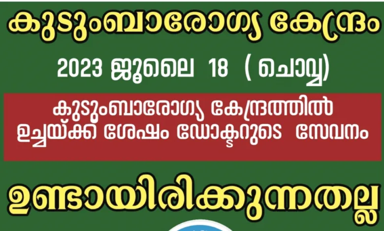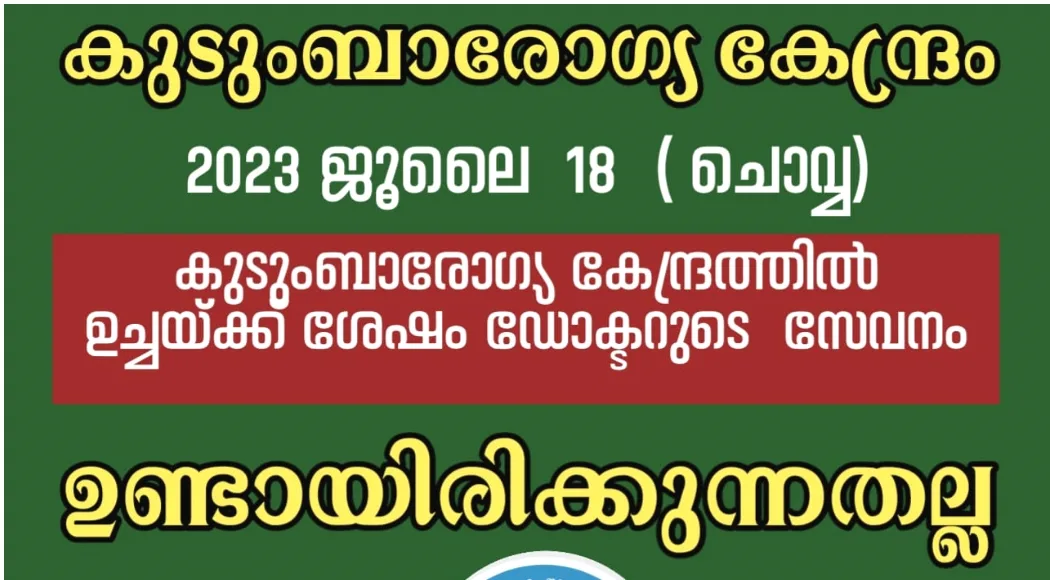 തിരുവമ്പാടി കുടുംബാരോഗ്യ കേന്ദ്രത്തിൽ ഇന്ന് (18 ജൂലൈ 2023) ഉച്ചയ്ക്ക് ശേഷം ഡോക്ടറുടെ സേവനം ഉണ്ടായിരിക്കുന്നതല്ലന്ന് അധികൃതർ അറിയിച്ചു