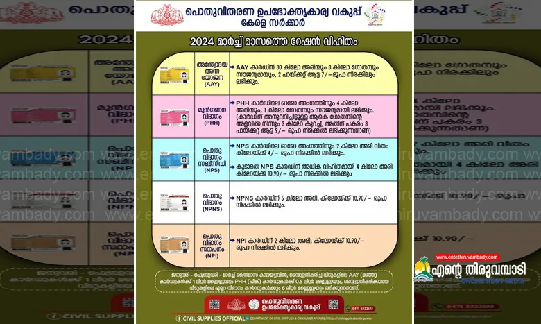 4, എല്ലാ വിഭാഗം റേഷൻ കാർഡുകൾക്കും അനുവദിച്ചിട്ടുള്ള, 2024 മാർച്ച് മാസത്തെ റേഷൻ വിഹിതം ചുവടെ ചേർക്കുന്നു…