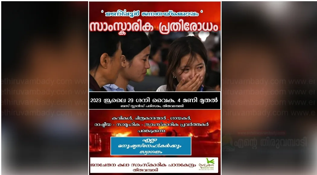 തിരുവമ്പാടി: മണിപ്പൂരിൽ നടക്കുന്ന വംശഹത്യക്കെതിരെയും അതിക്രമങ്ങൾക്കെതിരെയും പ്രതിഷേധമറിയിച്ചും മണിപ്പൂർ ജനതയ്ക്ക് പിന്തുണയർപ്പിച്ചും തിരുവമ്പാടി ജനചേതന കലാ സാംസ്കാരിക പഠന കേന്ദ്രത്തിന്റെ നേതൃത്വത്തിൽ തിരുവമ്പാടിയിൽ സാംസകാരിക പ്രതിരോധം സംഘടിപ്പിക്കും.ജൂലൈ 29 ശനിയാഴ്ച വൈകുന്നേരം 4 മണിയ്ക്ക് തിരുവമ്പാടി ബസ് സ്റ്റാൻഡ് പരിസരത്ത് നടക്കുന്ന സാംസ്കാരിക പ്രതിരോധ പരിപാടിയിൽ കവികൾ, ചിത്രകാരന്മാർ, ഗായകർ, രാഷ്ട്രീയ-സാമൂഹിക-സാംസ്കാരിക പ്രവർത്തകർ പങ്കെടുക്കും.