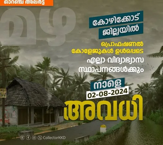 നാളെ 02 – 08 – 2024 കോഴിക്കോട് ജില്ലയിലെ വിദ്യാഭ്യാസ സ്ഥാപനങ്ങൾക്ക് അവധി.കോഴിക്കോട് ജില്ലയിൽ മഴ ശക്തമായി തുടരുന്നസാഹചര്യത്തിൽ, ജില്ലയിലെ പ്രൊഫഷണൽ കോളേജുകൾ ഉൾപ്പെടെയുള്ള എല്ലാ വിദ്യാഭ്യാസ സ്ഥാപനങ്ങൾക്കും നാളെ (02-08-2024) അവധി പ്രഖ്യാപിച്ചു. ജില്ലയിലെ അങ്കണവാടികള്ക്കും അവധി ബാധകമാണ്.മുൻകൂട്ടി നിശ്ചയിച്ച പരീക്ഷകൾക്ക് മാറ്റമില്ല.