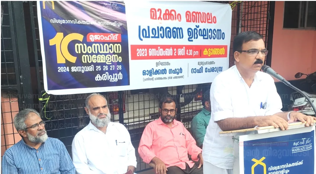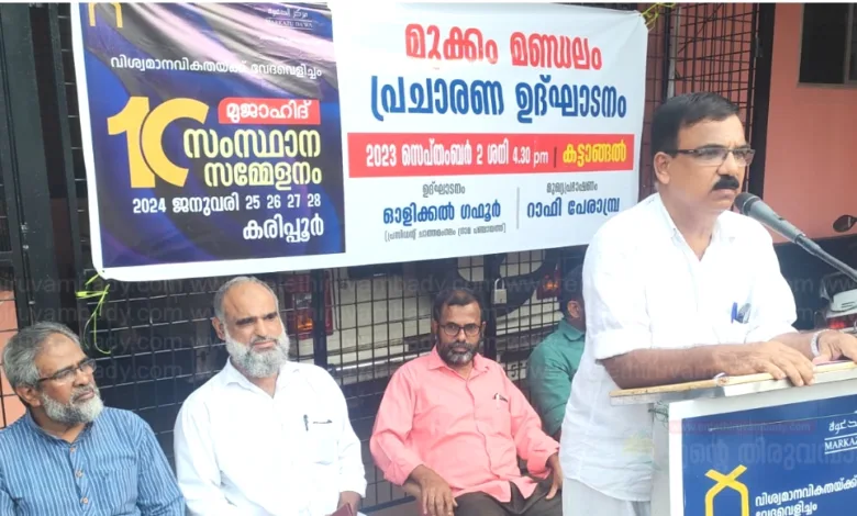കട്ടാങ്ങൽ:രാജ്യത്തിൻ്റെ ഭരണഘടനാ മൂല്യങ്ങൾ പരിരക്ഷിക്കാനും ധ്രുവീകരണ അജണ്ടകളെ ചെറുക്കാനും ഇന്ത്യ വിശാല സഖ്യത്തെ ശക്തിപ്പെടുത്തേണ്ടത് അനിവാര്യമാണെന്ന് കെട്ടാങ്ങൽ ബസാറിൽ നടന്ന വിശ്വമാനവികതക്ക് വേദവെളിച്ചം എന്ന പ്രമേയവുമായി കരിപ്പൂരിൽ നടക്കുന്ന മുജാഹിദ് സംസ്ഥാന സമ്മേളനത്തിൻ്റെ മുക്കം മണ്ഡലം പ്രചാരണോദ്ഘാടന സമ്മേളനം അഭിപ്രായപ്പെട്ടു. വരാനിരിക്കുന പൊതു തെരഞ്ഞെടുപ്പിൽ രാജ്യത്തിൻ്റെ ഭാവി മുമ്പിൽ കണ്ട് കൊണ്ടുള്ള നിലപാട് കൈകൊള്ളാൻ രാജ്യത്തിലെ പൗരൻമാർക്ക് കഴിയേണ്ടതുണ്ട്. മതമൂല്യങ്ങൾ ഉദ്ഘോഷിക്കുന്ന സാഹോദര്യ സന്ദേശം രാജ്യത്ത് പ്രചരിപ്പിക്കേണ്ടത് കാലത്തിൻ്റെ ആവശ്യമാണെന്നും സമ്മേളനം അഭിപ്രായപ്പെട്ടു.ചാത്തമംഗലം ഗ്രാമ പഞ്ചായത്ത് പ്രസിഡണ്ട് ഗഫൂർ ഓളിക്കൽ പ്രചാരണോദ്ഘാടനം നിർവഹിച്ചു.മുക്കം മണ്ഡലം കെ എൻ എം പ്രസിഡന്റ് പി ടി സുൽഫീകർ ആദ്ധ്യക്ഷം വഹിച്ചുറാഫി പേരാമ്പ്ര പ്രമേയ വിശദീകരണം നടത്തി.പി അബ്ദുസ്സലാം മദനി,എ സി അഹ്മദ്കുട്ടി മൗലവി,പി സി അബ്ദുൽഗഫൂർഅനീബ് പന്നിക്കോട്ഷഹീൻ നസീർസാജിദ മജീദ്ജമീല ടീച്ചർനേതൃത്വം നൽകികെ എൻ എം മണ്ഡലം സെക്രട്ടരി ആസാദ് കൂളിമാട് സ്വാഗതവുംബശീർ കക്കാട് നന്ദിയും പറഞ്ഞുPhoto അടിക്കുറിപ്പ്:മുജാഹിദ് പത്താം സംസ്ഥാന സമ്മേളനത്തിന്റെ മുക്കം മണ്ഡലം പ്രചാരണ സമ്മേളനം ചാത്തമംഗലം ഗ്രാമ പഞ്ചായത്ത് പ്രസിഡന്റ് ഓളിക്കൽ ഗഫൂർ ഉദ്ഘാടനം ചെയ്യുന്നു