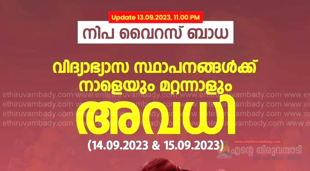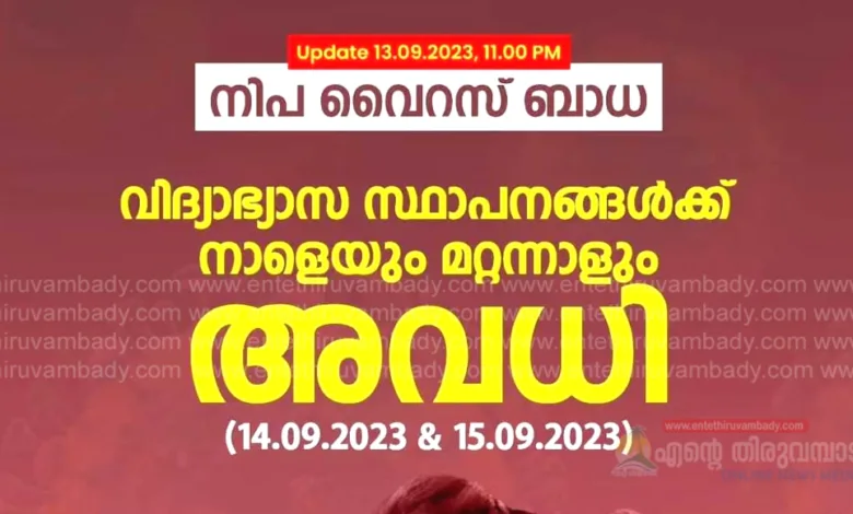 കോഴിക്കോട്: കോഴിക്കോട് ജില്ലയിലെ വിദ്യാഭ്യാസ സ്ഥാപനങ്ങൾക്ക് അവധി (14.09.2023 &15.09.2023) നിപ്പ വൈറസ് ബാധയുടെ പശ്ചാത്തലത്തിൽ ജാഗ്രതാ മുൻകരുതലുകളുടെ ഭാഗമായി കോഴിക്കോട് ജില്ലയിലെ പ്രൊഫഷണൽ കോളേജുകൾ ഉൾപ്പെടെയുള്ള എല്ലാ വിദ്യാഭ്യാസ സ്ഥാപനങ്ങൾക്കും (അങ്കണവാടി,മദ്രസകൾ ഉൾപ്പെടെ) നാളെയും മറ്റന്നാളും (14.09.2023 &15.09.2023 തീയ്യതികളിൽ) അവധിയായിരിക്കുമെന്ന് ജില്ലാ കലക്ടർ അറിയിച്ചു വിദ്യാഭ്യാസ സ്ഥാപനങ്ങൾക്ക് ഓൺലൈൻ ക്ലാസുകൾ ഒരുക്കാം. യൂണിവേഴ്സിറ്റി പരീക്ഷകളിൽ മാറ്റമില്ല.