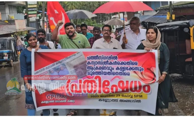 കോടഞ്ചേരി :ചത്തീസ്ഗഢില് മലയാളികളായ കന്യാസ്ത്രീകളെ കള്ളക്കേസില്പ്പെടുത്തി ജയിലിലടച്ചതില് പ്രതിഷേധിച്ച് സിപിഐ(എം) കണ്ണോത്ത് ലോക്കല് കമ്മിറ്റി നേതൃത്വത്തില് പ്രതിഷേധ പ്രകടനവും പൊതുയോഗവും സംഘടിപ്പിച്ചു.പ്രതിഷേധ പരിപാടി സിപിഐ(എം)ഏരിയ സെക്രട്ടറി വി.കെ.വിനോദ് ഉദ്ഘാടനം ചെയ്തു.ഏരിയ കമ്മിറ്റിയംഗം ജോര്ജ് കുട്ടി,ലോക്കല് സെക്രട്ടറി കെ.എം.ജോസഫ് മാസ്റ്റര്,കെ.എ.ജോണ് മാസ്റ്റര്,ഷെജിന്.എം.എസ്,സുബ്രഹ്മണ്യന് എം.സി തുടങ്ങിയവര് സംസാരിച്ചു.എം.എം.സോമന്,രജി.ടി.എസ്,ഇ.പി.നാസിര്,ബിന്ദു രജി,രജനി സത്യന്,അജയന് ചിപ്പിലിത്തോട്,റാഷിദ് ഗസ്സാലി,റീന സാബു,സുധീഷ് തെയ്യപ്പാറ,അനീസ തുടങ്ങിയവര് നേതൃത്വം നല്കി