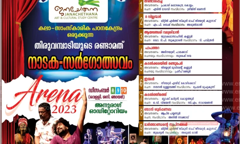 ജനചേതന സംഘടിപ്പിക്കുന്ന തിരുവാമ്പാടിയുടെ രണ്ടാമത് നാടക സർഗോത്സവം – അറീന 2023 – ഡിസംബർ 8, 9, 10 ( വെള്ളി, ശനി, ഞായർ ) തിരുവാമ്പാടി അനുരാഗ് ഓഡിറ്റോറിയത്തിൽ വെച്ചു നടത്തപ്പെടും. ഏറെ ചർച്ച ചെയ്യപ്പെട്ട അമേച്വർ നാടകങ്ങളായ കൊല്ലം പ്രകാശ് കലാകേന്ദ്രത്തിന്റെ തീണ്ടാരിപ്പച്ച, കൂറ്റനാട് ലിറ്റിൽ എർത്തിന്റെ ദ വില്ലന്മാർ , കണ്ണൂർ യുവകലാസാഹിതിയുടെ ആയഞ്ചേരി വല്യശ്മാൻ തുടങ്ങിയ പ്രമുഖ നാടകങ്ങൾക്കൊപ്പം ഏതാനും ഏകപാത്ര – ദ്വി പാത്ര നാടകങ്ങളും അരങ്ങേറും. പ്രാദേശിക സാഹിത്യ – കലാ പ്രതിഭകളുടെ സംഗമവും മറ്റു സാംസ്കാരിക പരിപാടികളും അനുബന്ധമായി സംഘടിപ്പിക്കുന്നുണ്ട്. നാടക- സർഗോത്സവത്തിന്റെ വിജയത്തിനായി തിരുവമ്പാടി എം എൽ എ ലിന്റോ ജോസഫ് , പഞ്ചായത്ത് പ്രസിഡന്റ് മേഴ്സി പുളിക്കാട്ടിൽ , കൂടരഞ്ഞി പഞ്ചായത്ത് പ്രസിഡന്റ് ആദർശ് ജോസഫ് എന്നിവർ രക്ഷാധികാരികളായും ജോസ് മാത്യു (ചെയർമാൻ) ഡോ. ജെയിംസ് പോൾ(ജനറൽ കൺവീനർ) ഡോ അബ്ബാസ് അലി (ഫെസ്റ്റിവൽ ഡയറക്ടർ ) എന്നിവർ ഉൾപ്പെട്ട 55 അംഗ സംഘാടക സമിതി രൂപീകരിച്ചു.