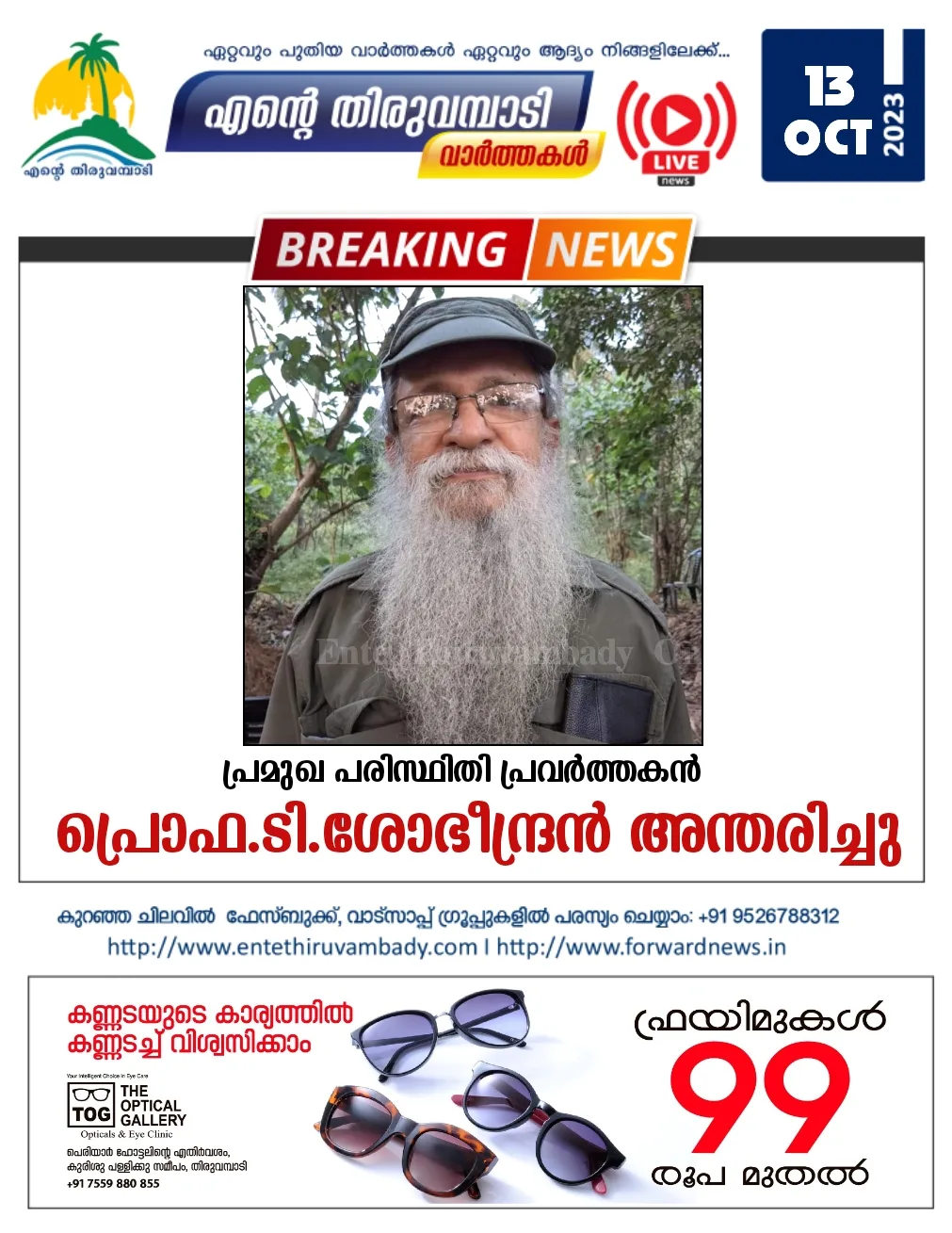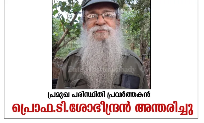 കോഴിക്കോട്: പ്രമുഖ പരിസ്ഥിതി പ്രവർത്തകനും അധ്യാപകനുമായ പ്രൊ. ടി. ശോഭീന്ദ്രൻ (76) അന്തരിച്ചു. ഹൃദയാഘാതത്തെ തുടർന്ന് വ്യാഴാഴ്ച രാത്രി കോഴിക്കോട്ടെ സ്വകാര്യ ആശുപത്രിയിലായിരുന്നു അന്ത്യം.പരിസ്ഥിതി പ്രവർത്തനങ്ങളിൽ സജീവമായിരുന്ന അദ്ദേഹത്തിന്റെ വസ്ത്രധാരണവും വ്യത്യസ്തമായിരുന്നു. പച്ച പാന്റും പച്ച ഷർട്ടും പച്ച തൊപ്പിയുമായിരുന്നു സ്ഥിരംവേഷം.