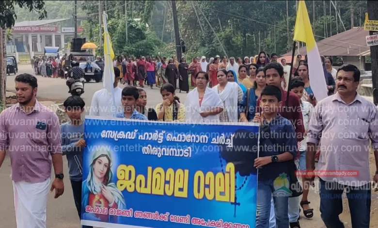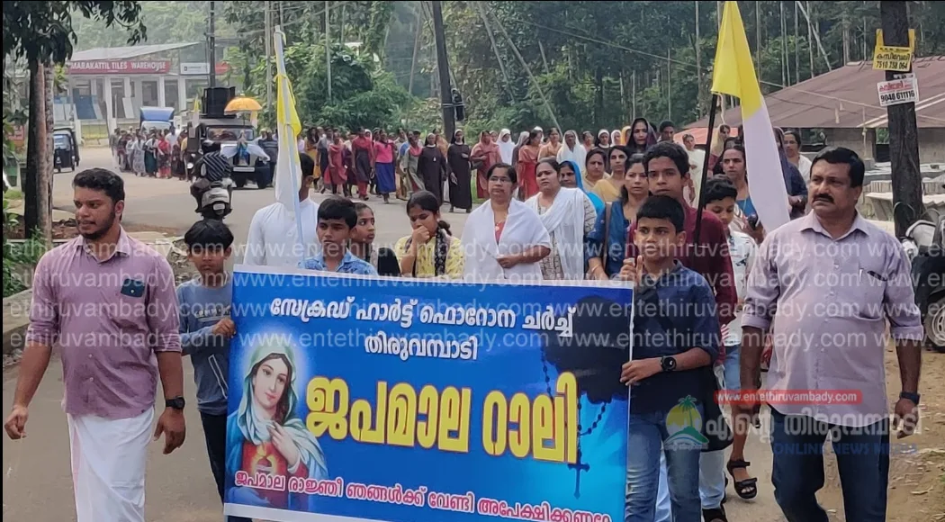 തിരുവമ്പാടി : തിരുഹൃദയ ഫൊറോന ദേവാലയത്തിന്റെ ആഭിമുഖ്യത്തിൽ അഖണ്ഡ ജപമാല നടക്കുന്ന പുല്ലൂരാംപാറ ബഥാനിയ കേന്ദ്രത്തിലേക്ക് ജപമാല റാലി നടത്തി. അഖണ്ഡ ജപമാലയുടെ 95 ാം ദിവസമാണ് തിരുവമ്പാടിയിലെ വിശ്വാസി സമൂഹം ജപമാല റാലി നടത്തിയത്. തിരുവമ്പാടി ദേവാലയത്തിൽ വച്ച് ഫൊറോനാ വികാരി ഫാ: തോമസ് നാഗ പറമ്പിൽ ജപമാല റാലി ഫ്ളാഗ് ഓഫ് ചെയ്തു. അസി.വികാരി ഫാ. ജിതിൻ പന്തലാടിക്കൽ ട്രസ്റ്റിമാരായ ജോൺസൺ പുരയിടത്തിൽ, ലിതിൻ മുതുകാട്ടുപറമ്പിൽ , സണ്ണി വെള്ളാരംകുന്നേൽ, പാരിഷ് സെക്രട്ടറി തോമസ് വലിയപറമ്പൻ, സണ്ണി പെണ്ണാപറമ്പിൽ,സിസ്റ്റർ ദീപ, ബെന്നി കിഴക്കേ പറമ്പിൽ , തങ്കച്ചൻ ആനന്തശ്ശേരിൽ എന്നിവർ ജപമാല റാലിക്ക് നേതൃത്വം നൽകി.101 ദിവസം നീണ്ടുനിൽക്കുന്ന അഖണ്ഡ ജപമാല സമർപ്പണം 27ന് സമാപിക്കും.