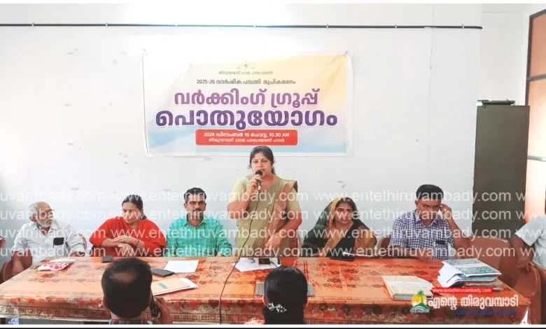 തിരുവമ്പാടി: തിരുവമ്പാടി ഗ്രാമ പഞ്ചായത്ത് 2025-26 വർഷിക പദ്ധതി രൂപീകരണത്തിന്റെ ഭാഗമായി വർക്കിംഗ് ഗ്രൂപ്പ് യോഗം നടത്തി ഗ്രാമ പഞ്ചായത്ത് ഹാളിൽ നടന്ന വർക്കിംഗ് യോഗം ഗ്രാമ പഞ്ചായത്ത് പ്രസിഡന്റ് ബിന്ദു ജോൺസൺ ഉദ്ഘാടനം ചെയ്തു.. വൈസ് പ്രസിഡന്റ് കെ.എ അബ്ദുറഹിമാൻ അധ്യക്ഷത വഹിച്ചു. സ്ഥിരം സമിതി അദ്ധ്യക്ഷരായ ലിസി മാളിയേക്കൽ, രാജു അമ്പലത്തിങ്കൽ, റംല പോലക്കൽ , മെമ്പർ കെ.എം മുഹമ്മദലി, അസി.സെക്രട്ടറി ബൈജു തോമസ്, വിവിധ വാർഡ് മെമ്പർ, നിർവ്വഹണ ഉദ്യോഘസ്ഥർ തുടങ്ങിയവർ സംസാരിച്ചു.പദ്ധതി ആസൂത്രണ പ്രക്രിയയുടെ ആദ്യ പടിയായ വർക്കിംഗ് ഗ്രൂപ്പ് യോഗത്തിന് ജനപ്രതിനിധികളും വിവിധ നിർവ്വഹണ ഉദ്യോഘ സ്ഥരും, വർക്കിംഗ് ഗ്രൂപ്പ് അംഗങ്ങളും നേതൃത്വം നൽകി. 2025-26 വർഷ പദ്ധതിക്കാവശ്യമായ 15 വിഷയമേഖലകളിലായി ഗ്രൂപ്പ് ചർച്ച നടക്കുകയും പദ്ധതി നിർദേശങ്ങൾ തയ്യാറാക്കുകയും ചെയ്താണ് പരിപാടി സമാപിച്ചത്.