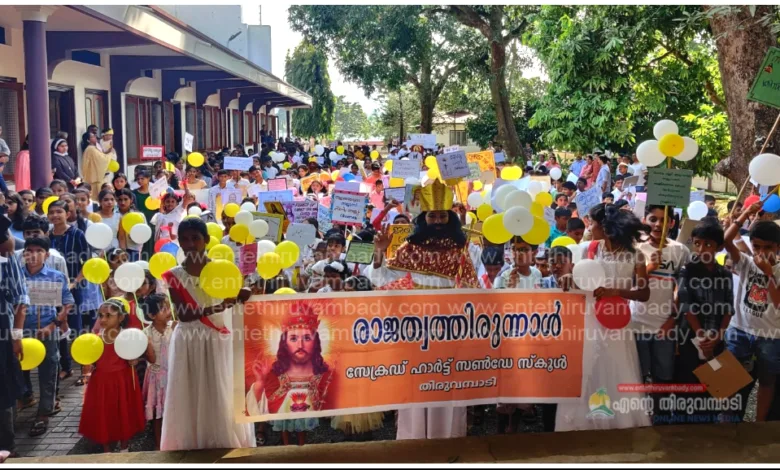 തിരുവമ്പാടി: തിരുഹൃദയ ഫൊറോന ഇടവക സൺഡേ സ്കൂളിന്റെ ആഭിമുഖ്യത്തിൽ ക്രിസ്തുവിന്റെ രാജത്വ തിരുനാൾ വിവിധ പരിപാടികളോടെ ആഘോഷിച്ചു. ഫൊറോന വികാരി ഫാ: തോമസ് നാഗ പറമ്പിൽ തിരുനാൾ ആഘോഷങ്ങൾ ഉദ്ഘാടനം ചെയ്തു. അസി.വികാരി ഫാ: ജിതിൻ പന്തലാടിക്കൽ ,ബ്രദർ എബിൻ ജോയി , പ്രധാന അധ്യാപകൻ സജി കളപ്പുരക്കൽ, സിസ്റ്റർ റോസ് മരിയ, തോമസ് വലിയപറമ്പൻ, പിടിഎ പ്രസിഡന്റ് ബൈജു കാഞ്ഞിരത്തിങ്കൽ , സോൺസ് പുറത്തൂട്ട്, തങ്കച്ചൻ പുരയിടം, റിജേഷ് മങ്ങാട്, സീന അമ്പലത്തുങ്കൽ എന്നിവർ നേതൃത്വം നൽകി. തിരുനാളിനോടു ബന്ധിച്ച് വർണ ശബളമായ വിശ്വാസ റാലി നടത്തി.