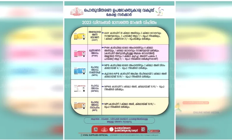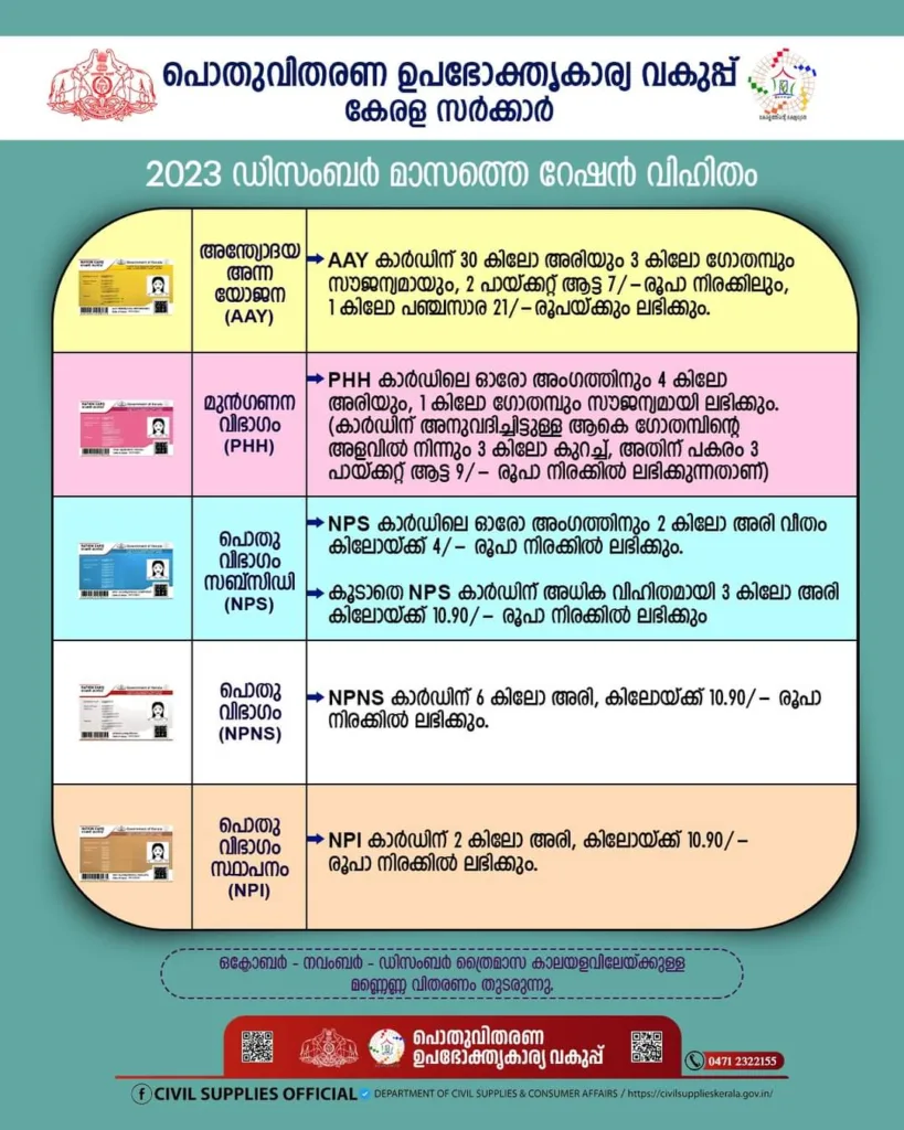 2, നാളെ (01.12.2023) റേഷൻ കടകൾക്ക് അവധി ആണ്. 3, 2023 ഡിസംബർ മാസത്തെ റേഷൻ വിതരണം 02.12.2023 (ശനിയാഴ്ച) മുതൽ ആരംഭിക്കുന്നതാണ്. 4, എല്ലാ വിഭാഗം റേഷൻ കാർഡുകൾക്കും അനുവദിച്ചിട്ടുള്ള, 2023 ഡിസംബർ മാസത്തെ റേഷൻ വിഹിതം ചുവടെ ചേർക്കുന്നു… ഓരോ റേഷൻ കാർഡിനും അനുവദിച്ചിട്ടുള്ള റേഷൻ സാധനങ്ങളുടെ ഇനം തിരിച്ചുള്ള അളവ് അറിയുന്നതിനായി ക്ലിക്ക് ചെയ്യുക
