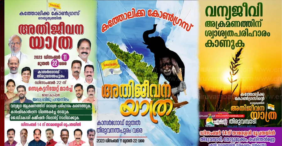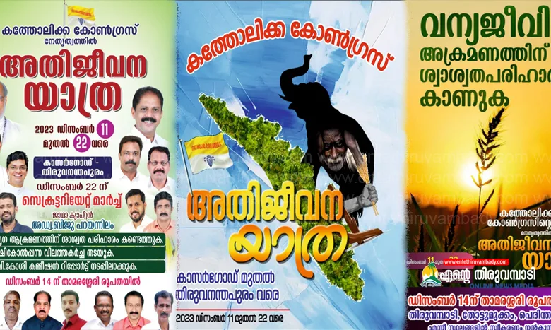 തിരുവമ്പാടി: കത്തോലിക്ക കോൺഗ്രസ് ഗ്ലോബൽ സമിതിയുടെ ആഭിമുഖ്യത്തിൽ ഗ്ലോബൽ പ്രസിഡന്റ് അഡ്വക്കേറ്റ് ബിജു പറയനിലം നയിക്കുന്ന കേരള അതിജീവന യാത്രക്ക് ഡിസംബർ 14 ന് താമരശ്ശേരി രൂപതയിലെ വിവിധ സ്ഥലങ്ങളിൽ സ്വീകരണം നൽകും. താമരശ്ശേരിയിൽ നിന്ന് ആരംഭിക്കുന്ന യാത്ര കോടഞ്ചേരി നെല്ലിപ്പൊയിൽ പുലരാമ്പാറ തിരുവമ്പാടി കൂടരഞ്ഞി മരഞ്ചാട്ടി തോട്ടുമുക്കം മഞ്ചേരി പെരിന്തൽമണ്ണ എന്നിവിടങ്ങളിലൂടെ കടന്നുപോകും. തിരുവമ്പാടിയിലും തോട്ടുമുക്കത്തും പെരിന്തൽമണ്ണയും പൊതുസമ്മേളനവും റാലിയും സംഘടിപ്പിക്കുമെന്ന്