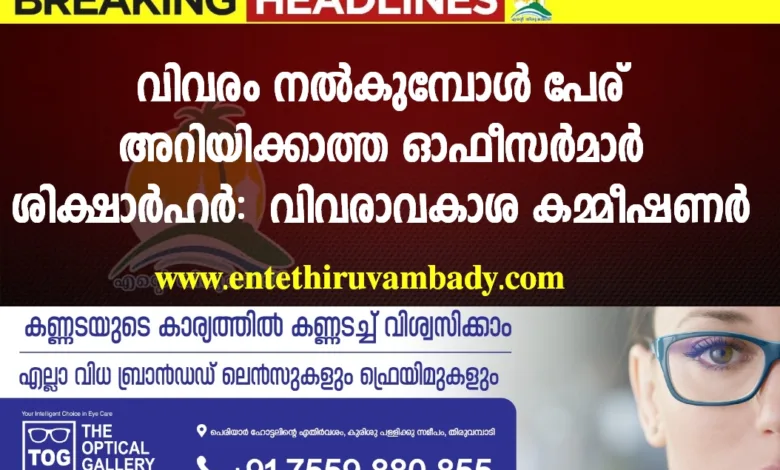 കോഴിക്കോട്:വിവരം നൽകുമ്പോൾ പേര് അറിയിക്കാത്ത ഓഫീസർമാർ ശിക്ഷാർഹരെന്ന് വിവരാവകാശ കമ്മീഷണർ എ അബ്ദുൽ ഹക്കീം. ചൊവ്വാഴ്ച കോഴിക്കോട് ആസൂത്രണ ഭവൻ കോൺഫറൻസ് ഹാളിൽ കമ്മീഷൻ നടത്തിയ തെളിവെടുപ്പിൽ സംസാരിക്കുകയായിരുന്നു അദ്ദേഹം.വിവരാവകാശ അപേക്ഷകരെ ഒന്നാം അപ്പീൽ അധികാരി ഹിയറിംഗിന് വിളിക്കുന്നതിന് ചട്ടം അനുവദിക്കുന്നില്ലെന്നും അദ്ദേഹം പറഞ്ഞു. വിവരാവകാശ ഓഫീസർ തനിക്ക് ലഭിച്ച അപേക്ഷകളിൽ അവശ്യപ്പെടുന്ന വിവരങ്ങൾ മറ്റൊരു ഓഫീസിലാണ് ഉള്ളതെങ്കിൽ അവിടേക്ക് അയച്ചുകൊടുക്കണം. ഇത്തരം അപേക്ഷകൾക്ക് അപേക്ഷാ ഫീസ് ഇല്ലാതെ വിവരങ്ങൾ ലഭ്യമാക്കണം. ഇപ്രകാരം അപേക്ഷ രണ്ടാമത്തെ ഓഫീസിലേക്ക് അയച്ചു നൽകാതിരുന്ന കോഴിക്കോട് ജില്ലയിലെ നാല് ഓഫീസർമാരെ ചട്ടപ്രകാരം ശിക്ഷിക്കാൻ കമ്മീഷൻ തീരുമാനിച്ചതായും കമ്മീഷണർ പറഞ്ഞു.വിവരങ്ങൾ ലഭിക്കാൻ കാലതാമസം ഉണ്ടായി എന്നുള്ള നാല് കേസുകളിൽ കമ്മീഷൻ തൽക്ഷണം വിവരങ്ങൾ ലഭ്യമാക്കി. അപേക്ഷകന് ഒരു മാസം കഴിഞ്ഞ് വിവരം നൽകിയ മലബാർ ദേവസ്വം ബോർഡ് ഉദ്യോഗസ്ഥനെതിരെ സെക്ഷൻ 20(1) പ്രകാരം ശിക്ഷാ നടപടി എടുക്കാൻ തീരുമാനിച്ചു.വണ്ടിപ്പേട്ട ഹൗസിങ് ബോർഡ് കോളനിയിൽ അനധികൃതമായി ഒഴിപ്പിച്ച ഭവനം മറ്റൊരാൾക്ക് അനുവദിച്ച് നൽകി എന്ന പരാതിയിന്മേൽ ഉന്നതതല അന്വേഷണത്തിന് കമ്മീഷൻ ഉത്തരവിട്ടു. പുതുപ്പാടി ഇലക്ട്രിക്കൽ സെക്ഷനിലെ കരാർ ജീവനക്കാരുടെ പ്രശ്നങ്ങൾ സംബന്ധിച്ച അന്വേഷണങ്ങൾക്ക് ഒരാഴ്ചക്കകം മറുപടി ലഭ്യമാക്കാമെന്ന് ബന്ധപ്പെട്ട ഓഫീസർമാർ രേഖാമൂലം എഴുതി നൽകി. കുത്താട്ടുകുളം നഗരസഭയിലെ വിവരാവകാശ അപേക്ഷക്ക് മറുപടി നൽകാതിരുന്ന ഇപ്പോഴത്തെ എൽ.എസ്.ജി.ഡി കോഴിക്കോട് നോർത്ത് സർക്കിൾ ഓഫീസ് ഉദ്യോഗസ്ഥൻ ഹർജിക്കാരന് വിവരം നൽകാൻ താൽപര്യം എടുത്തില്ല എന്ന് കമ്മീഷൻ വിലയിരുത്തി. ഇയാൾക്കെതിരെ ശിക്ഷാ നടപടി എടുക്കാൻ തീരുമാനിച്ചു.വിവരം ലഭ്യമല്ല എന്ന മറുപടി കുറിച്ച കത്തിൽ സ്വന്തം പേരും മറ്റ് വിവരങ്ങളും മറച്ച് വെച്ചതിന് ഉദ്യോഗസ്ഥന് ഇമ്പോസിഷനും കൊടുത്തു. കോഴിക്കോട് മുൻസിഫ് ഓഫീസിൽ ലഭിച്ച വിവരാവകാശ അപേക്ഷക്ക് 14 ദിവസത്തിനകം മറുപടി നൽകാനും കമ്മീഷൻ നിർദ്ദേശിച്ചു. ബേപ്പൂർ പോർട്ട് ഓഫീസിൽ ലഭിച്ച വിവരാവകാശ അപേക്ഷയുടെ മറുപടിയിൽ ബന്ധപ്പെട്ട ഉദ്യോഗസ്ഥന്റെ പേരും മറ്റ് വിവരങ്ങളും ചേർക്കാത്തതിൽ വീഴ്ച്ച വരുത്തിയ ഉദ്യോഗസ്ഥക്കും കമ്മീഷൻ ഇമ്പോസിഷൻ നൽകി. വടകര പോലീസ് സ്റ്റേഷനിൽ വിവരാവകാശ നിയമപ്രകാരം ആവശ്യപ്പെട്ട എഫ്.ഐ.ആർ കോപ്പി നൽകാനും കമ്മീഷൻ നിർദ്ദേശിച്ചു. വടകര ആർ.ഡി.ഒ ഓഫീസിലെ വിവരാവകാശ നിയമം പ്രകാരം ലഭിച്ച അപേക്ഷയിൽ ചട്ടങ്ങൾ പാലിക്കാത്തതിനാൽ ഫയൽ ആർ.ഡി.ഒക്ക് മടക്കി