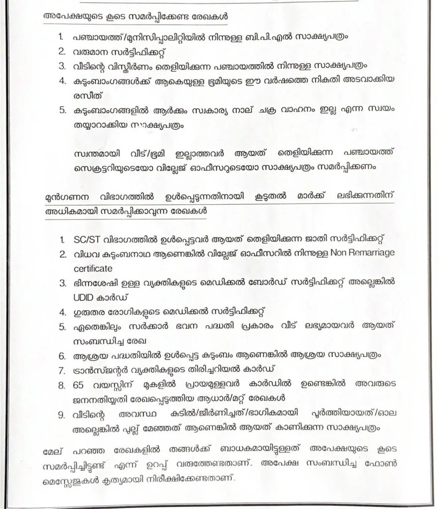 അപേക്ഷയുടെ കൂടെ സമർപ്പിക്കേണ്ട രേഖകൾ