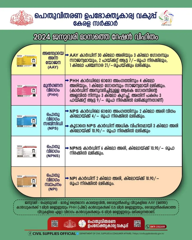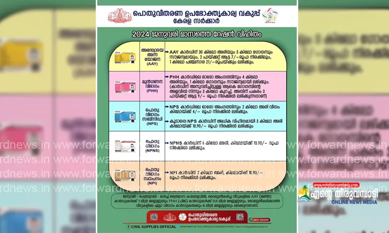 3, 2024 ജനുവരി മാസത്തെ റേഷൻ വിതരണം 02.01.2024 (ചൊവ്വാഴ്ച) മുതൽ ആരംഭിക്കുന്നതാണ്.