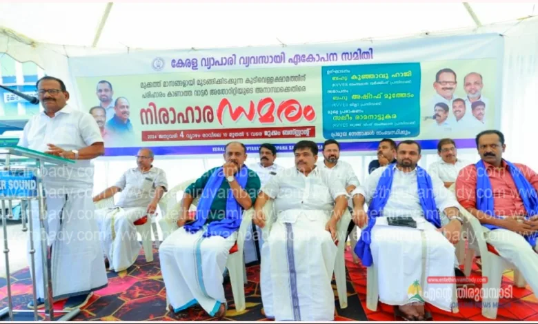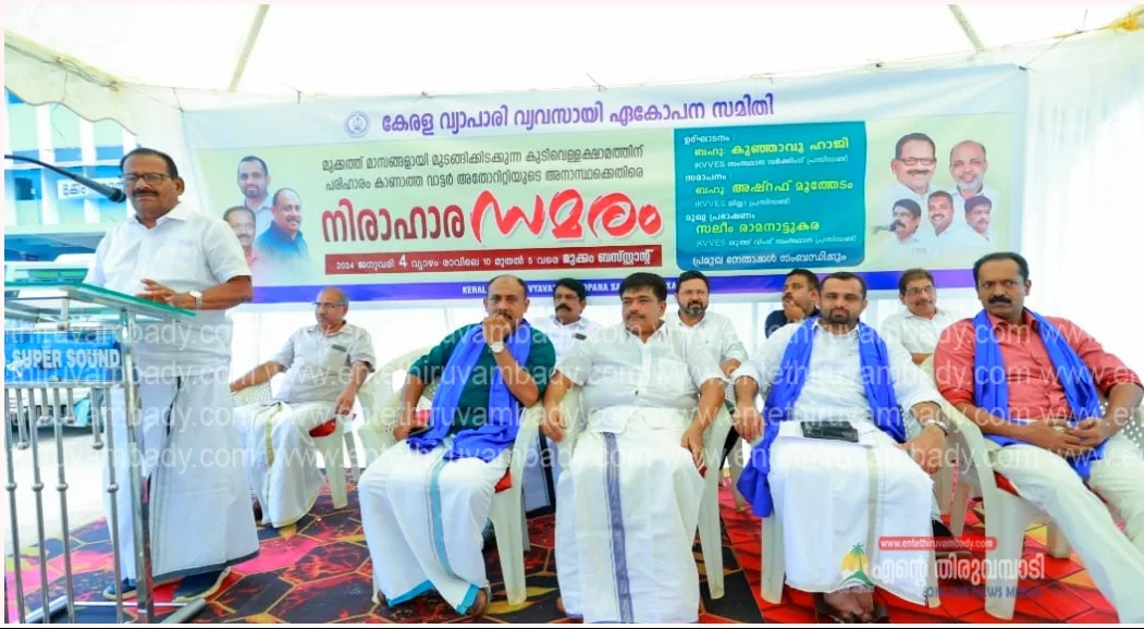 മുക്കം:മാസങ്ങളോളമായി മുടങ്ങിക്കിടക്കുന്ന കുടിവെള്ളം പുനസ്ഥാപിക്കണമെന്ന് ആവശ്യപ്പെട്ടുകൊണ്ട് കേരള വ്യാപാരി വ്യവസായി ഏകോപന സമിതി മുക്കം യൂണിറ്റ് പ്രസിഡണ്ട് പി.അലി അക്ബർ ജനറൽ സെക്രട്ടറി വി.പി. അനീസുദ്ദീൻ ട്രഷറർ ടിറ്റോ തോമസ് എന്നിവരുടെ നേതൃത്വത്തിൽ മുക്കം ബസ് സ്റ്റാൻഡിൽ രാവിലെ 10 മണി മുതൽ ആരംഭിച്ച നിരാഹാര സമരം സംസ്ഥാന വർക്കിംഗ് പ്രസിഡണ്ട് കുഞ്ഞാവു ഹാജി ഉദ്ഘാടനം ചെയ്തു. മുക്കത്ത് മുടങ്ങിക്കിടക്കുന്ന കുടിവെള്ള വിതരണത്തിന് എത്രയും പെട്ടെന്ന് ശാശ്വത പരിഹാരം കാണണമെന്നും എട്ടു മാസത്തോളം പ്രശ്നം നീട്ടിക്കൊണ്ട് പോയ വാട്ടർ അതോറിറ്റിയുടെ നടപടി അംഗീകരിക്കാൻ സാധിക്കില്ലെന്നും സർക്കാർ ഉദ്യോഗസ്ഥന്മാരുടെ അനാസ്ഥയാണ് ഇത് ചൂണ്ടിക്കാണിക്കുന്നതെന്നും എത്രയും പെട്ടെന്ന് പ്രാശ്ന പരിഹാരം കണ്ടില്ലെങ്കിൽ വിഷയം സംസ്ഥാന കമ്മിറ്റി ഏറ്റെടുക്കേണ്ടി വരുമെന്നും അധികാരികൾ പെട്ടെന്ന് തന്നെ പരിഹാരം കാണണമെന്നും അദ്ദേഹം കൂട്ടിച്ചേർത്തു. സമാപനംജില്ലാ പ്രസിഡണ്ട് അഷ്റഫ് മൂത്തേടം നിരാഹാരമനുഷ്ഠിച്ചവർക്ക് നാരങ്ങാനീര് നൽകി സമരം അവസാനിപ്പിച്ചു.യൂണിറ്റ് പ്രസിഡണ്ട് പി. അലി അക്ബർ അദ്ധ്വക്ഷത വഹിച്ച നിരാഹര സമരത്തിൽ സംസ്ഥാന യൂത്ത് വിങ് പ്രസിഡണ്ട് സലിം രാമനാട്ടുകര മുഖ്യപ്രഭാഷണം നടത്തി. ജില്ലാ ജനറൽ സെക്രട്ടറി ജിജി കെ തോമസ് ജില്ലാ വൈസ് പ്രസിഡണ്ട് റഫീഖ് മാളിക സംസ്ഥാന പ്രവർത്തക സമിതി അംഗം ചന്ദ്രൻ കപ്പിയേടത്ത് പി.പി. അബ്ദുൽ മജീദ് പ്രേമൻ മണാശ്ശേരി എ.ടി. അസ്ലം നൂറുദ്ദീൻ സനം എം.കെ ഫൈസൽ നിസാർ ബെല്ല റൈഹാന നാസർ, തുടങ്ങിയവരും, വിവിധ വ്യാപാര സംഘടന നേതാക്കളും ചടങ്ങിൽ പങ്കെടുത്ത ആശംസകൾ അർപ്പിച്ചു .ജനറൽ സെക്രട്ടറി അനീസുദ്ദീൻ വി.പി. സ്വാഗതവും ട്രഷറർ ഡിറ്റോ തോമസ് നന്ദി പറഞ്ഞു..