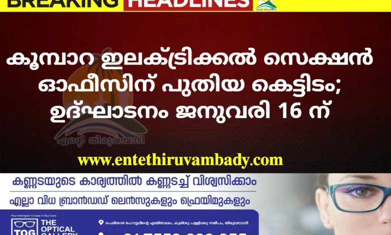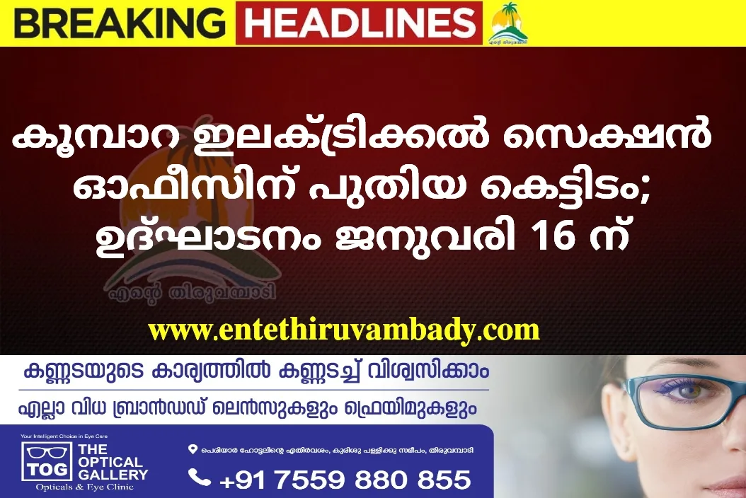 കൂമ്പാറയിൽ ഇലക്ക്ട്രിക്കൽ സെക്ഷൻ ഓഫീസിനായി നിർമ്മിച്ച പുതിയ കെട്ടിടത്തിന്റെ ഉദ്ഘാടനം 2024 ജനുവരി 16 ന് വൈകീട്ട് 4 മണിക്ക് ലിന്റോ ജോസഫ് എം.എൽ.എയുടെ അധ്യക്ഷതയിൽ നടക്കുന്ന ചടങ്ങിൽ വൈദ്യുതി വകുപ്പുമന്ത്രി കെ കൃഷ്ണൻകുട്ടി നിർവ്വഹിക്കും. ഉദ്ഘാടന പരിപാടി വിജയിപ്പിക്കുന്നതിനായി കൂമ്പാറ വെൽനസ് സെന്ററിൽ ചേർന്ന സ്വാഗത സംഘ രൂപീകരണ യോഗം തിരുവമ്പാടി എം.എൽ.എ ലിന്റോ ജോസഫ് ഉദ്ഘാടനം ചെയ്തു. കൂടരഞ്ഞി ഗ്രാമ പഞ്ചായത്ത് പ്രസിഡണ്ട് ആദർശ് ജോസഫ് അധ്യക്ഷത വഹിച്ച യോഗത്തിൽ ജനപ്രതിനിധികളും ഉദ്യോഗസ്ഥരും സംബന്ധിച്ചു. വിവിധ ഉപസമിതികൾ രൂപീകരിച്ചു പ്രവർത്തനനം ആരംഭിച്ചു. ചടങ്ങിൽ കൂടരഞ്ഞി പഞ്ചായത്ത് വൈസ് പ്രസിഡന്റ് മേരി തങ്കച്ചൻ, എക്സിക്യൂട്ടീവ് എഞ്ചിനീയർ നിഷാ ബാനു തുടങ്ങിയവർ സംസാരിച്ചു. ശിവകുമാർ സ്വാഗതവും സുരേഷ് ബാബു നന്ദിയും പറഞ്ഞു.