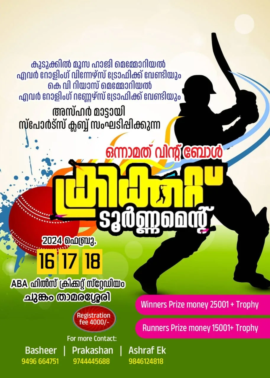 താമരശ്ശേരി : അസ്ഹർ സ്പോർട്സ് ക്ലബ് സംഘടിപ്പിക്കുന്ന ഒന്നാമത് വിന്റ് ബോൾ ക്രിക്കറ്റ് ടൂർണമന്റ് 2024 ഫെബ്രുവരി 16,17,18 തിയ്യതികളിൽ നടത്താൻ തീരുമാനിച്ചു.താമരശ്ശേരി അസ്ഹർ മാട്ടായി ക്രിക്കറ്റ് ക്ലബ്ബ് സംഘടിപ്പിക്കുന്ന ടൂര്ണമെന്റില് ജില്ലയിലെ 16 പ്രഗത്ഭ ടീമുകളാണ് മാറ്റുരക്കുന്നത്. നോക്കൗട്ട് അടിസ്ഥാനത്തില് 08 ഓവറുകള് വീതമുള്ള ടൂര്ണമെന്റ് പുതുതായി നിർമ്മിച്ച താമരശ്ശേരി ചുങ്കം എ.ബി.എ ഹിൽസ് ക്രിക്കറ്റ് സ്റ്റേഡിയത്തിൽ വെച്ച് നടക്കും.കുടുക്കിൽ മൂസഹാജി മെമ്മോറിയൽ വിന്നേഴ്സ് ട്രോഫിക്കും പ്രൈസ് മണിക്ക് വേണ്ടിയും, കെ.വി റിയാസ് മെമ്മോറിയൽ റണ്ണേഴ്സ് ട്രോഫിക്കും പ്രൈസ് മണിക്ക് വേണ്ടിയും, സംഘടിപ്പിക്കുന്ന ടൂർണമെന്റിൽ മികച്ച ബാറ്റര്, ബൗളര്, വികറ്റ് കീപര്, മാന് ഓഫ് ദി ടൂര്ണമെന്റ് അവാര്ഡുകള്ക്ക് പുറമെ ഓരോ കളിയിലേയും മികച്ച പ്രകടനത്തെ അടിസ്ഥാനമാക്കി മാന് ഓഫ് ദ മാച് അവാര്ഡും നല്കും.*ടൂർണമന്റ് സംഘാടക സമിതി രൂപീകരിച്ചു*ടൂർണമെൻറ് നടത്തിപ്പിനായി ബഷീർ പത്താൻ ചെയർമാനും, ഷംസീർ ഇടവലം കൺവീനറും, ബേബി ഓടങ്ങൾ ട്രഷററുമായി സ്വാഗത സംഘം നിലവിൽ വന്നു. വൈസ് ചെയർമാൻ റഹീം കുടുക്കിൽ, ജോയിൻ കൺവീനർ അഷ്റഫ് കൊടുവള്ളി, രക്ഷാധികാരികളായി അലി കാരാടി, യൂസഫ് മാസ്റ്റർ, സി.കെ സാഹിദ് എന്നിവരെയും തിരഞ്ഞെടുത്തു.വിന്നേഴ്സിന് 25,001 രൂപയും ട്രോഫിയും, റണ്ണേഴ്സിന് 15,001 രൂപയും ട്രോഫിയും നൽകാൻ തീരുമാനിച്ചു. ഇന്ത്യൻ ക്രിക്കറ്റ് ടീമിലേക്ക് കോഴിക്കോട് ജില്ലയില് നിന്നും താരങ്ങളെ വളര്ത്തിയെടുക്കുക എന്ന മഹത്തായ ലക്ഷ്യത്തോടെ താമരശ്ശേരി ആസ്ഥാനമാക്കി അസ്ഹർ മാട്ടായി സ്പോര്ട്സ് അകാഡമി ആരംഭിക്കുക എന്ന ഉദ്ദേശ്യ ലക്ഷ്യത്തിന്റെ ഭാഗമായാണ് ടൂര്ണമെന്റ് സംഘടിപ്പിക്കുന്നത് എന്ന് സംഘാടക സമിതി ചെയർമാൻ താമരശ്ശേരി വാവാട് ഉസ്താദ് ഓഡിറ്റോറിയത്തിൽ ചേർന്ന യോഗത്തിൽ പറഞ്ഞു._കൂടുതൽ വിവരങ്ങൾക്ക് ബന്ധപ്പെടുക_ : 9496664751, 9744445688, 9846124818
