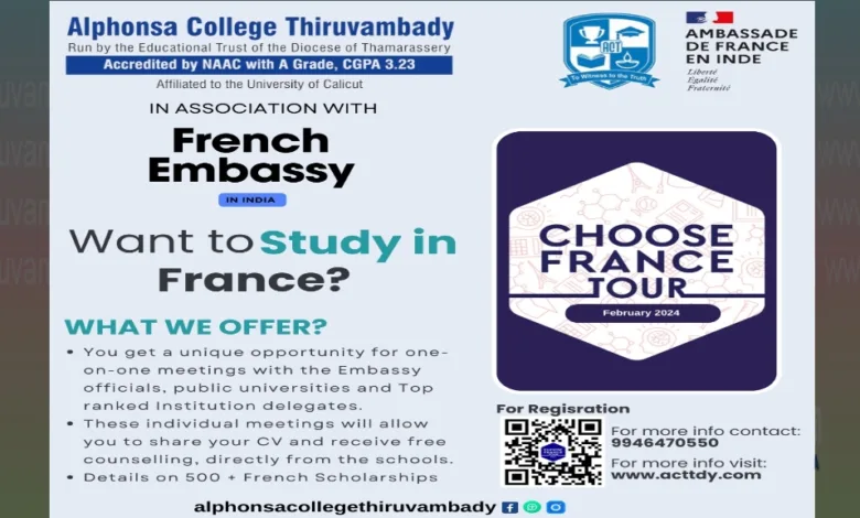 തിരുവമ്പാടി : തിരുവമ്പാടി അൽഫോൻസാ കോളേജും ഇന്ത്യയിലെ ഫ്രഞ്ച് എംബസിയുടെ നേതൃത്വത്തിലുള്ള ഫ്രഞ്ച് ഇൻസ്റ്റിറ്റുട്ട് ഇൻ ഇന്ത്യയുടെയും ഫ്രാൻസ് കാംപസ് ഇന്ത്യയുടെയും സഹകരണത്തോടെ ചൂസ് ഫ്രാൻസ് ടൂർ എന്ന പേരിൽ ഉന്നതവിദ്യാഭ്യാസ ഉച്ചകോടി സംഘടിപ്പിക്കുന്നു. പുതിയ ദേശീയവിദ്യാഭ്യാസ നയത്തിന്റെയും സംസ്ഥാന സർക്കാരിന്റെ പുതിയ ബജറ്റ് നിർദ്ദേശങ്ങളുടെയും പ്രയോഗവൽക്കരണമാണ് കോളേജ് ഇതിലൂടെ ലക്ഷ്യം ഇടുന്നത്.
