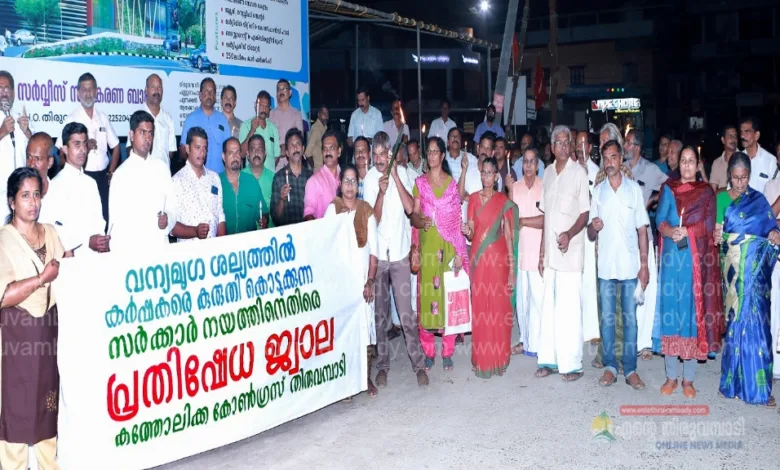 തിരുവമ്പാടി: വന്യമൃഗശല്യത്തിൽ കർഷകരെ സഹായിക്കാത്ത സർക്കാർ നയത്തിനെതിരെ കത്തോലിക്ക കോൺഗ്രസിന്റെ നേതൃത്വത്തിൽ തിരുവമ്പാടിയിൽ പ്രതിഷേധ ജ്വാല സംഘടിപ്പിച്ചു. നാട്ടിലിറങ്ങി ജനങ്ങളെ കൊല്ലുകയും കൃഷിനശിപ്പിക്കുകയും ചെയ്യുന്ന വന്യമൃഗങ്ങളെ കൊല്ലാൻ നിയമങ്ങൾ ഉണ്ടായിട്ടും അത് യഥാസമയം നടപ്പാക്കാത്തത് ജനങ്ങളോടുള്ള വെല്ലുവിളിയാണെന്ന് പ്രതിഷേധ ജ്വാല ഉദ്ഘാടനം ചെയ്ത തിരുവമ്പാടി ഫൊറോന വികാരി ഫാ. തോമസ് നാഗപറമ്പിൽ അഭിപ്രായപ്പെട്ടു.