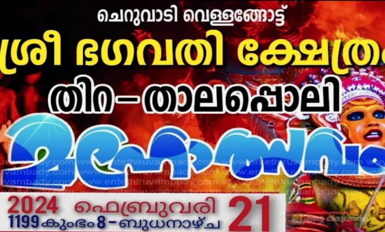 ചെറുവാടി: ചെറുവാടി വെള്ളങ്ങോട്ട് ശ്രീ ഭഗവതി ക്ഷേത്രത്തിലെ ഈ വർഷത്തെ തിറ താലപ്പൊലി മഹോത്സവം 2024 ഫെബ്രുവരി 21 (ബുധനാഴ്ച) വിവിധ കലാപരിപാടി കളോട് ആഘോഷിക്കുവാൻ തീരുമാനിച്ചു.