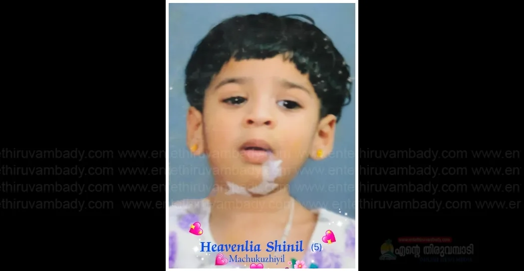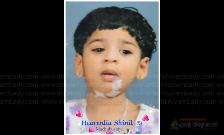 കോടഞ്ചേരി : അടിമണ്ണ് മച്ചുകുഴിയിൽ ഷിനിലിന്റെ മകൾ ഹെവൻലിയ ഷിനിൽ (5) നിര്യാതയായി. മാതാവ്: മിനു (കോടഞ്ചേരി പ്ലാത്തോട്ടത്തിൽ കുടുംബാഗം) സഹോദങ്ങൾ : സ്റ്റെവിൻ , മെർവിൻ, ഒലിവിയ. സംസ്കാരം:ഇന്ന് (19/2/24.തിങ്കൾ) വൈകുന്നേരം 4 മണിക്ക് ചെമ്പുകടവ് സെന്റ് ജോർജ് ദേവാലയത്തിൽ.