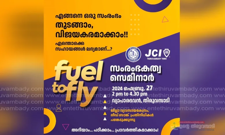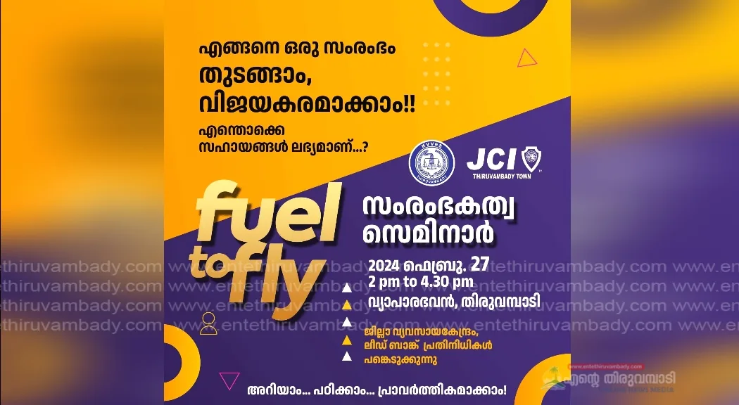 തിരുവമ്പാടി : ജേസിസ് തിരുവമ്പാടി ടൗണിന്റെ ആഭിമുഖ്യത്തിൽ നാളെ തിരുവമ്പാടി വ്യാപാരഭവൻ ഹാളിൽ സൗജന്യ സംരംഭകത്വ സെമിനാർ സംഘടിപ്പിക്കുന്നു. എങ്ങനെ ഒരു സംരംഭം തുടങ്ങാം, വിജയകരമാക്കാം, എന്തൊക്കെ സഹായങ്ങൾ ലഭ്യമാണ് എന്നീ വിഷയങ്ങളെക്കുറിച്ച് വിദഗ്ധർ ക്ലാസുകൾ എടുക്കുന്നു. കൂടുതൽ വിവരങ്ങൾക്ക് 9447365065, 9745436951