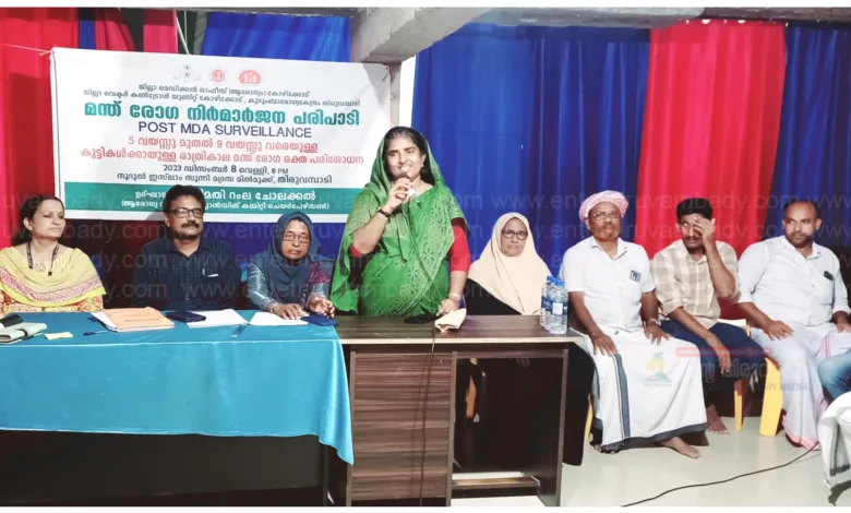 തിരുവമ്പാടി:കോഴിക്കോട് ജില്ലാ മെഡിക്കൽ ഓഫീസിന്റെയും ജില്ലാ വെക്ടർ കൺട്രോൾ യൂണിറ്റിന്റെയും തിരുവമ്പാടി കുടുംബാരോഗ്യ കേന്ദ്രത്തിന്റെയും സംയുക്താഭിമുഖ്യത്തിൽ തിരുവമ്പാടി മിൽമുക്ക് നൂറുൽ ഇസ്ലാം സുന്നി മദ്രസ്സ, കൂളിപ്പൊയിൽ, വാപ്പാട്ട് എന്നീ പ്രദേശങ്ങളിൽ വച്ച് മന്ത് രോഗ നിർമാർജന പരിപാടിയുടെ ഭാഗമായി 5 വയസ്സ് മുതൽ 9 വയസ്സ് വരെയുള്ള കുട്ടികൾക്കായുള്ള രാത്രികാല മന്ത് രോഗ രക്ത പരിശോധന ക്യാമ്പും ബോധവൽക്കരണ ക്ലാസ്സും നടത്തി. മിൽമുക്ക് മദ്രസയിൽ വെച്ച് നടത്തിയ ക്യാമ്പ് ആരോഗ്യ വിദ്യാഭ്യാസ സ്റ്റാന്റിംഗ് കമ്മിറ്റി ചെയർപേഴ്സൺ റംലചോലക്കൽ ഉദ്ഘാടനം ചെയ്തു. ഹെൽത്ത് ഇൻസ്പെക്ടർ എം സുനീർ സ്വാഗതം പറഞ്ഞു. സൽമത്ത് ടീച്ചർ അധ്യക്ഷത വഹിച്ചു. ‘മന്ത് രോഗനിർമാർജനം – കുട്ടികളുടെ രാത്രികാല രക്ത പരിശോധന ‘ എന്ന വിഷയത്തിൽ കോഴിക്കോട് ഡിവിസി യൂണിറ്റ് അസിസ്റ്റൻറ് എന്റമോളജിസ്റ്റ് പി ബിന്ദു ക്ലാസ്സെടുത്തു. തെക്കഞ്ചേരി ഹംസഹാജി, ജമീല കീലത്ത്, ജൂനിയർ ഹെൽത്ത് ഇൻസ്പെക്ടർമാരായ പി.പി മുഹമ്മദ് ഷമീർ , കെ ഷാജു , കെ.ബി ശ്രീജിത്ത്, മുഹമ്മദ് മുസ്തഫ ഖാൻ , എസ് എം അയന, ഡിവിസി യൂണിറ്റ് ഫീൽഡ് അസിസ്റ്റൻറ്മാർ ഫീൽഡ് വർക്കർമാർ, അങ്കണവാടി ടീച്ചർമാർ , ആശാവർക്കർമാർ എന്നിവർ ക്യാമ്പിന് നേതൃത്വം നൽകി. ക്യാമ്പിൽ വെച്ച് 71 കുട്ടികളുടെ രക്തസാമ്പിൾ പരിശോധനയ്ക്ക് എടുത്തു.