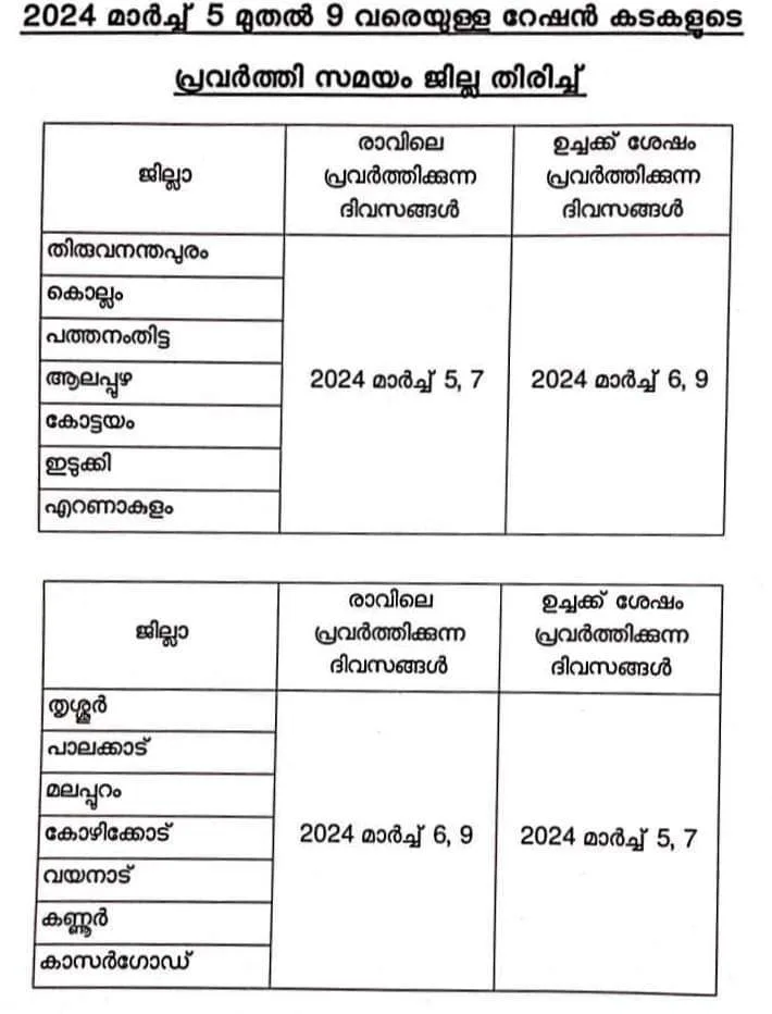 2024 മാർച്ച് 5 മുതൽ 9 വരെയുള്ള സംസ്ഥാനത്തെ റേഷൻകടകളുടെ പ്രവർത്തി സമയം ചുവടെ ചേർക്കുന്നു. രാവിലെ പ്രവർത്തിക്കുന്ന റേഷൻ കടകളുടെ സമയം 8 മണിമുതൽ 1 മണിവരെയും ഉച്ചയ്ക്ക് ശേഷം പ്രവർത്തിക്കുന്ന റേഷൻ കടകളുടെ സമയം 2 മണിമുതൽ 7 മണിവരെയുമാണ്. 08-03-2024 വെള്ളിയാഴ്ച ശിവരാത്രിയോടനുബന്ധിച്ച് റേഷൻ കടകൾക്ക് അവധിയായിരിക്കും.