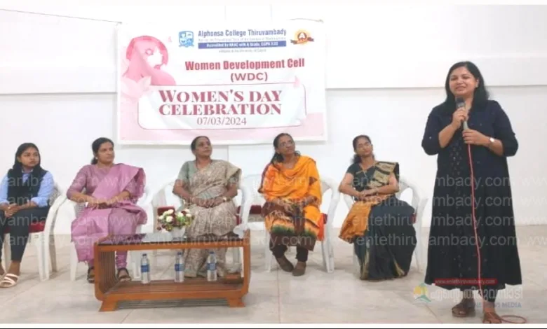 തിരുവമ്പാടി : അൽഫോൻസ കോളേജ് വിമൻസ് ഡെവലപ്മെന്റ് സെല്ലിന്റെ ആഭിമുഖ്യത്തിൽ വനിതാദിനം ആഘോഷിച്ചു. കോളേജ് പ്രിൻസിപ്പൽ ഡോ. ചാക്കോ കെ വി വനിതാദിന സന്ദേശം വിദ്യാർത്ഥികൾക്ക് നൽകി. തിരുവമ്പാടി ഫ്ളോറൻസ ഫാഷൻ ബൊട്ടിക് മാനേജിങ് ഡയറക്ടർ ലിൻ്റാ വിനീത് “സ്ത്രീ സംരംഭകത്വത്തിലൂടെ സ്ത്രീശക്തികരണം” എന്ന വിഷയത്തിൽ വിദ്യാർത്ഥികളുമായി സംവാദം നടത്തി. തുടർന്ന് മലബാർ ഗോൾഡ് ആൻഡ് ഡയമണ്ട്സ് , കോളേജിലെ വിവിധ മേഖലകളിൽ കഴിവു തെളിയിച്ച മിടുക്കരായ ആറ് വിദ്യാർത്ഥിനികളെ ആദരിച്ചു. ലീവിന സിബി,അലീന ലെയ്സൻ, റെസ്ബിൻ അബ്ബാസ്,നിതാ ഹുസൈൻ, ജ്യോതിസ് ജോസ്, സ്നേഹ കെ പി എന്നീ വിദ്യാർത്ഥിനികൾ ആണ് വ്യത്യസ്ത രംഗങ്ങളിൽ തിളങ്ങി നിന്നതിന് ആദരവ് ഏറ്റുവാങ്ങിയത്. വൈസ് പ്രിൻസിപ്പൽ ഫാദർ ഷെനീഷ് അഗസ്റ്റിൻ, വിമൻസ് ഡെവലപ്മെന്റ് സെൽ കോഡിനേറ്റർ മിസ്. സ്നേഹ മാത്യു, ദീപ ഡോമിനിക്, സാലിഹ നാസർ, മലബാർ ഗോൾഡ് അസിസ്റ്റൻറ് സ്റ്റോർ ഹെഡ് ജംനാസ് ഹംസ എന്നിവർ സംസാരിച്ചു. , സാനി തോമസ്, ഷിജി ഫ്രാൻസിസ്, ജിന്റ ലൂക്ക, ലിവീന സിബി എന്നിവർ പ്രോഗ്രാമിന് നേതൃത്വം നൽകി.